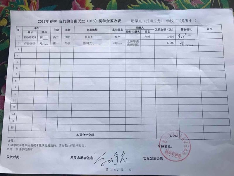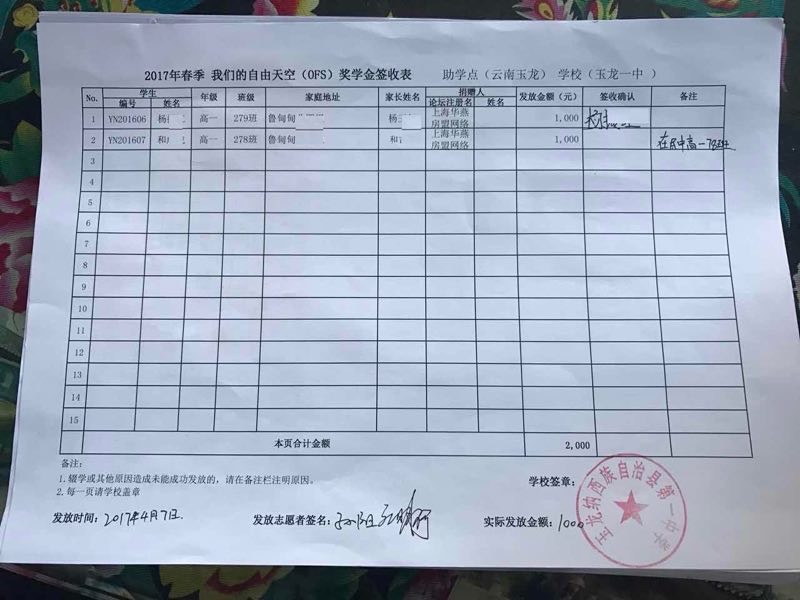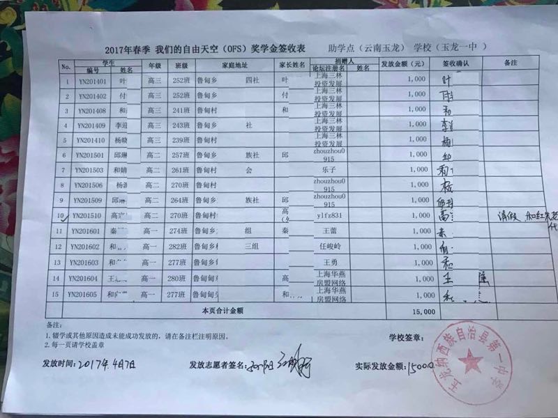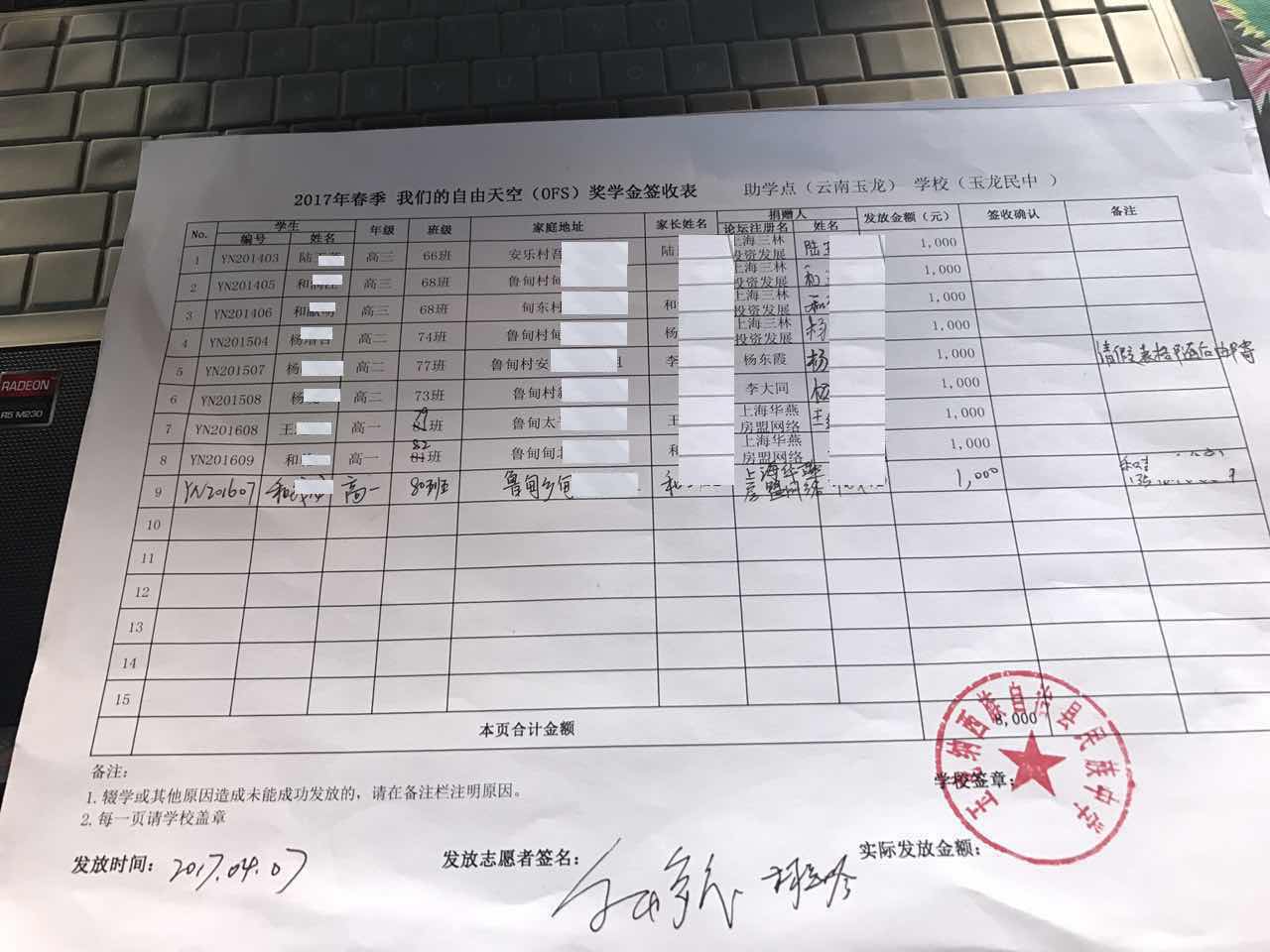 OFS走访志愿者在2017年4月5日--7日对云南省丽江市玉龙纳西族自治县鲁甸乡助学点进行了走访工作,本帖针对鲁甸助学点初中升学奖学金发放工作做具体阐述。 :c8^db`"