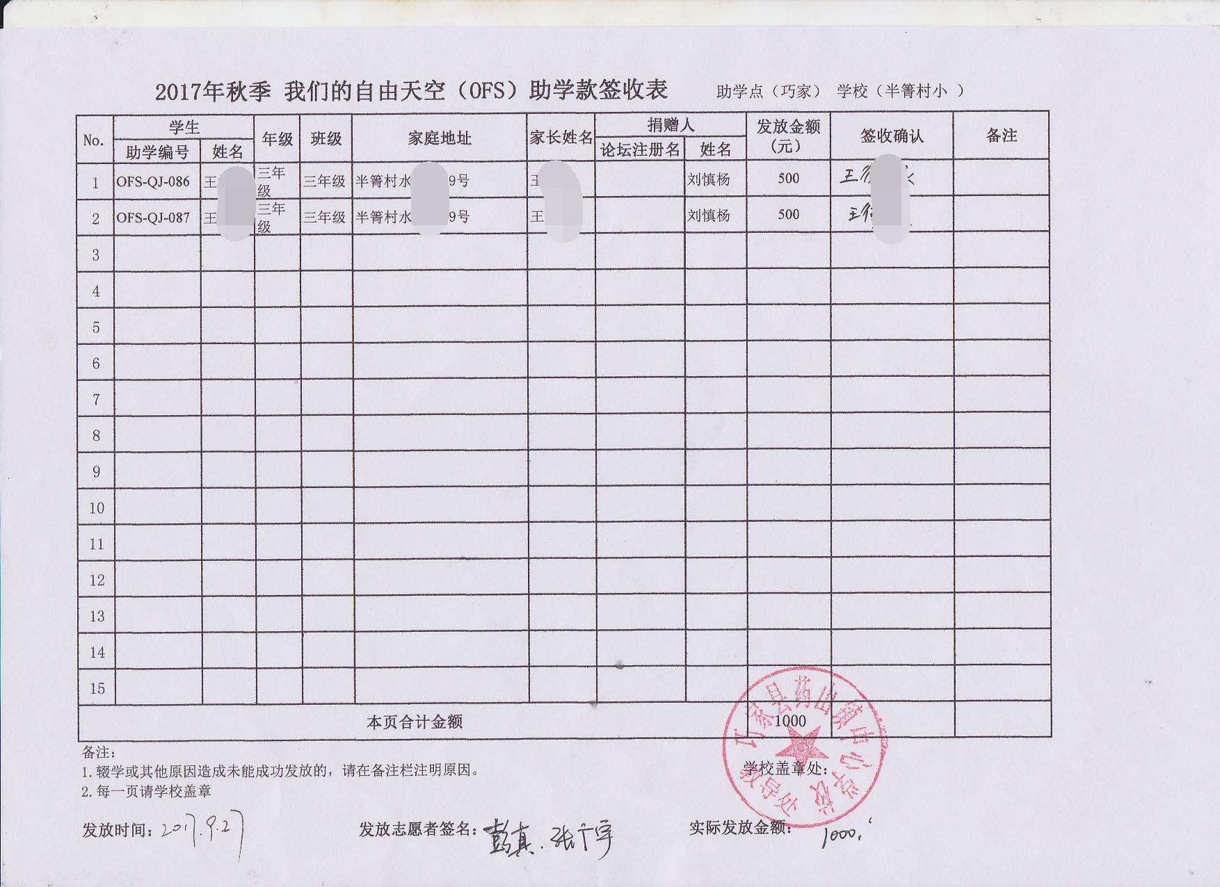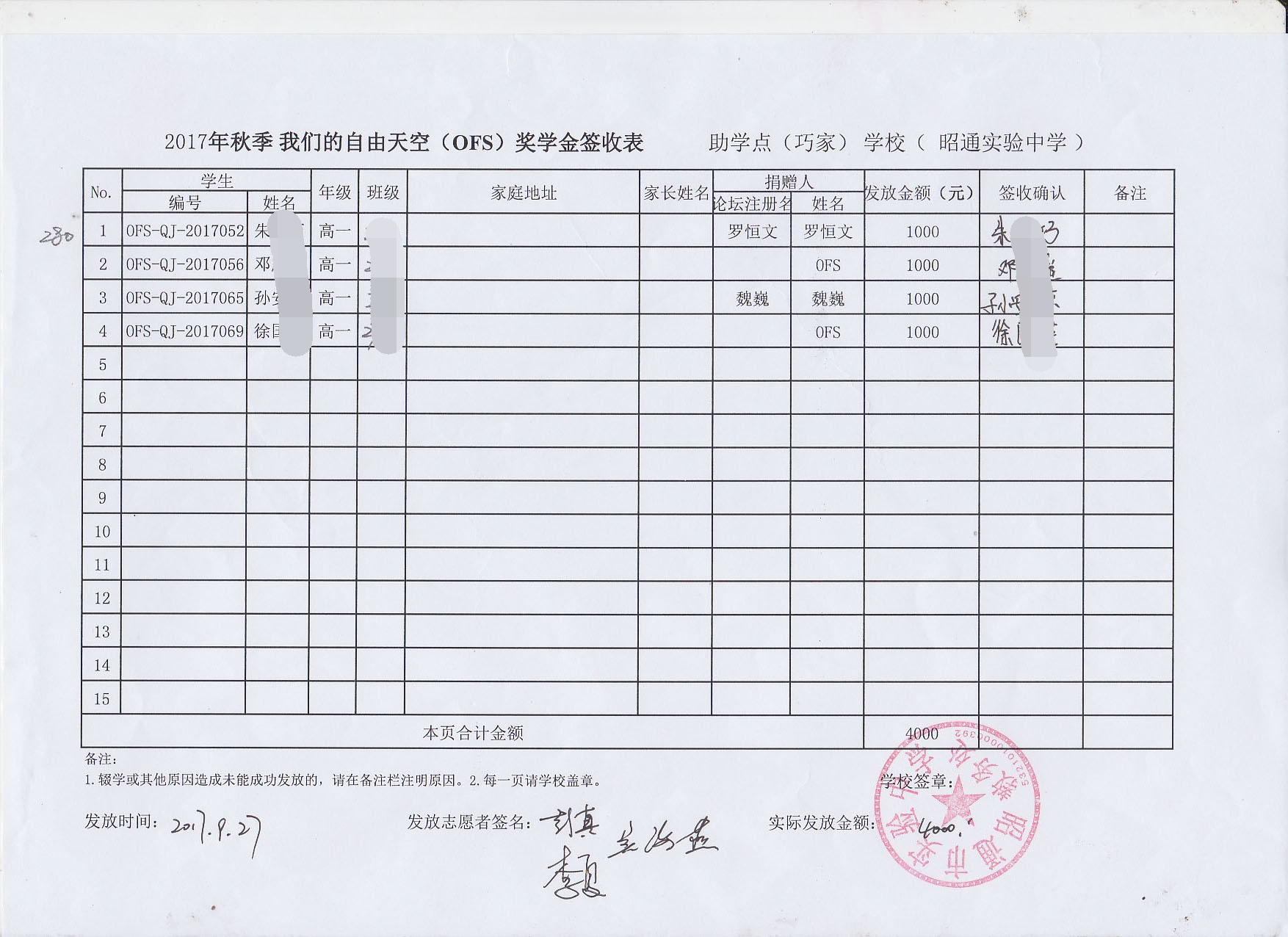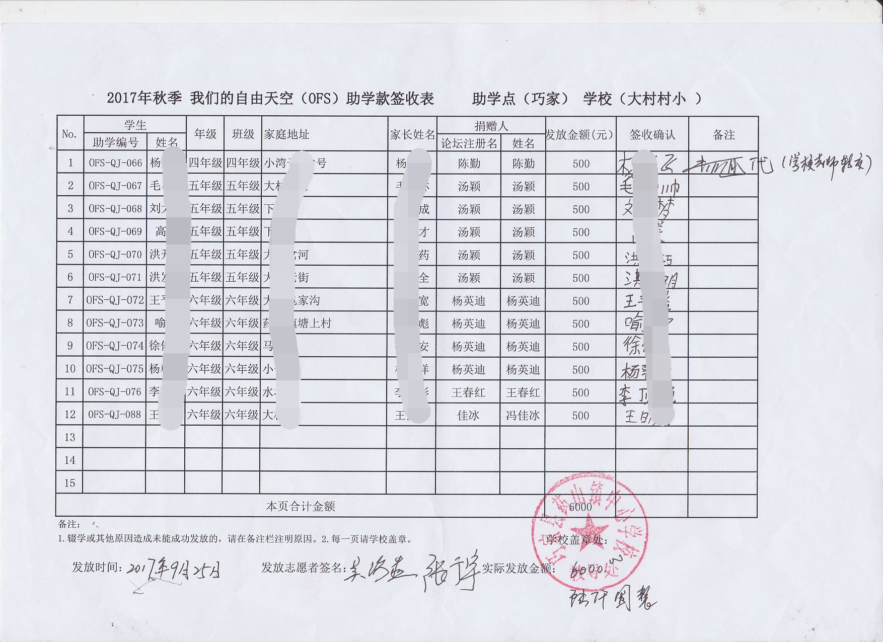OFS志愿者历经5天的走访完成了秋季助学款和奖学金的发放工作,具体发放情况如下: d%.|MAE