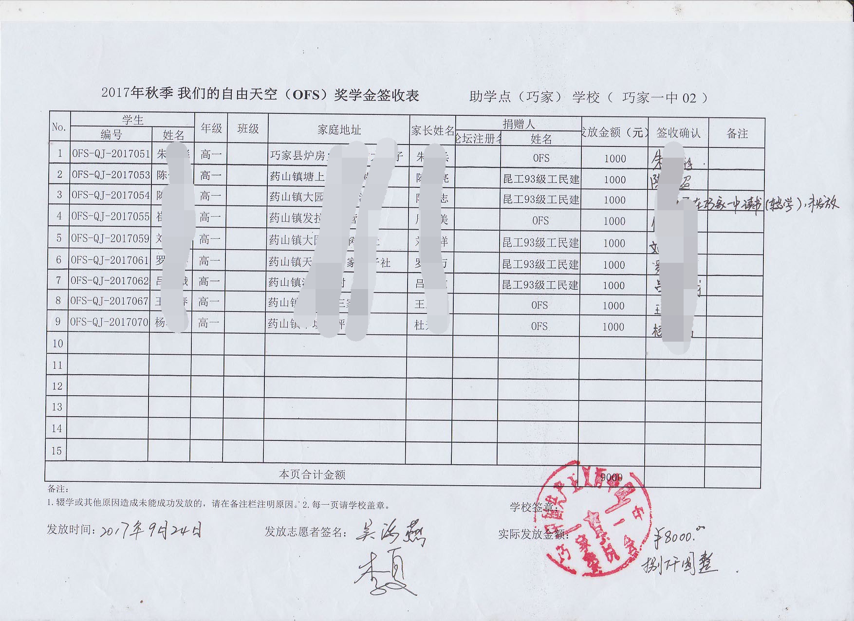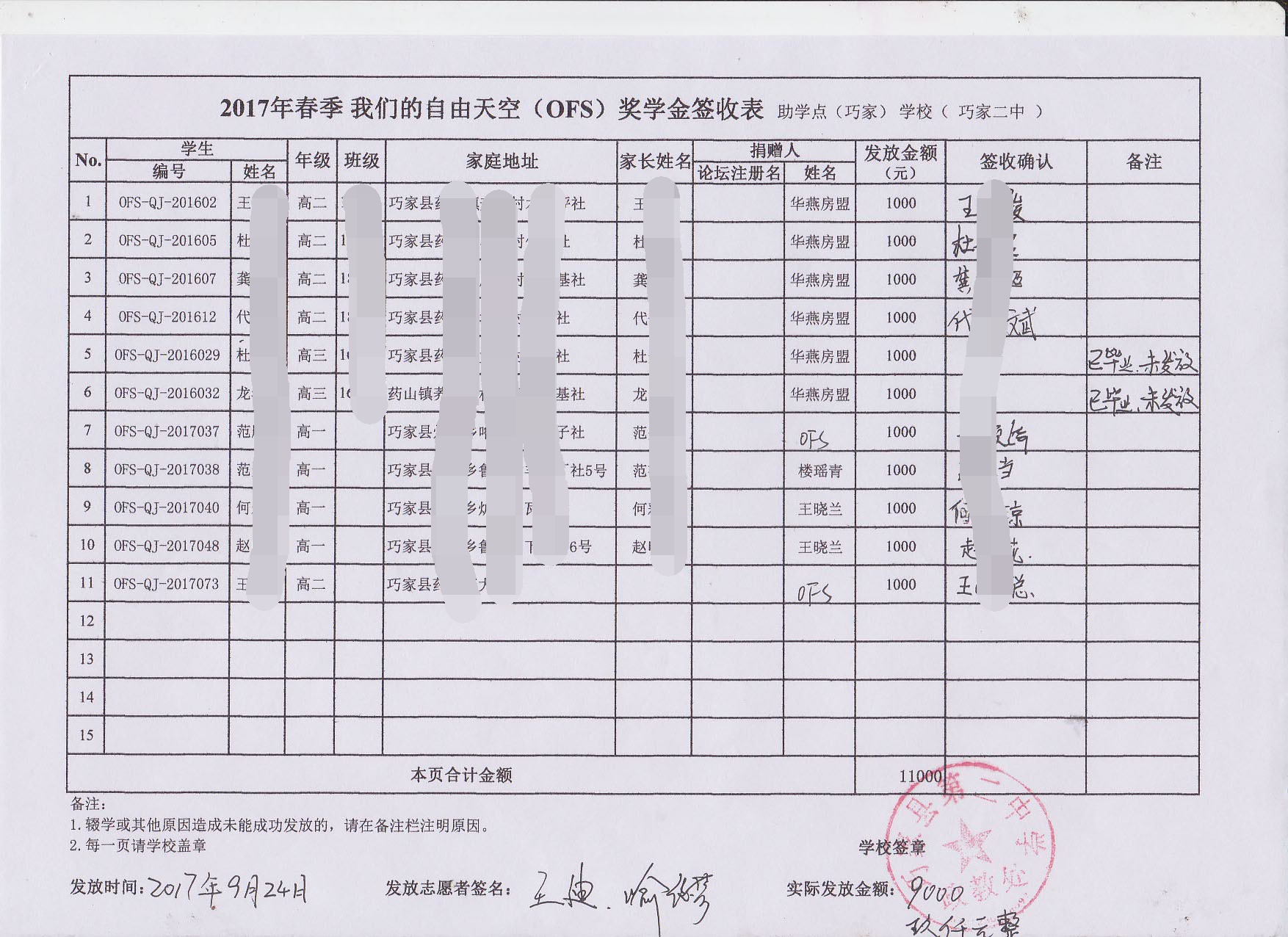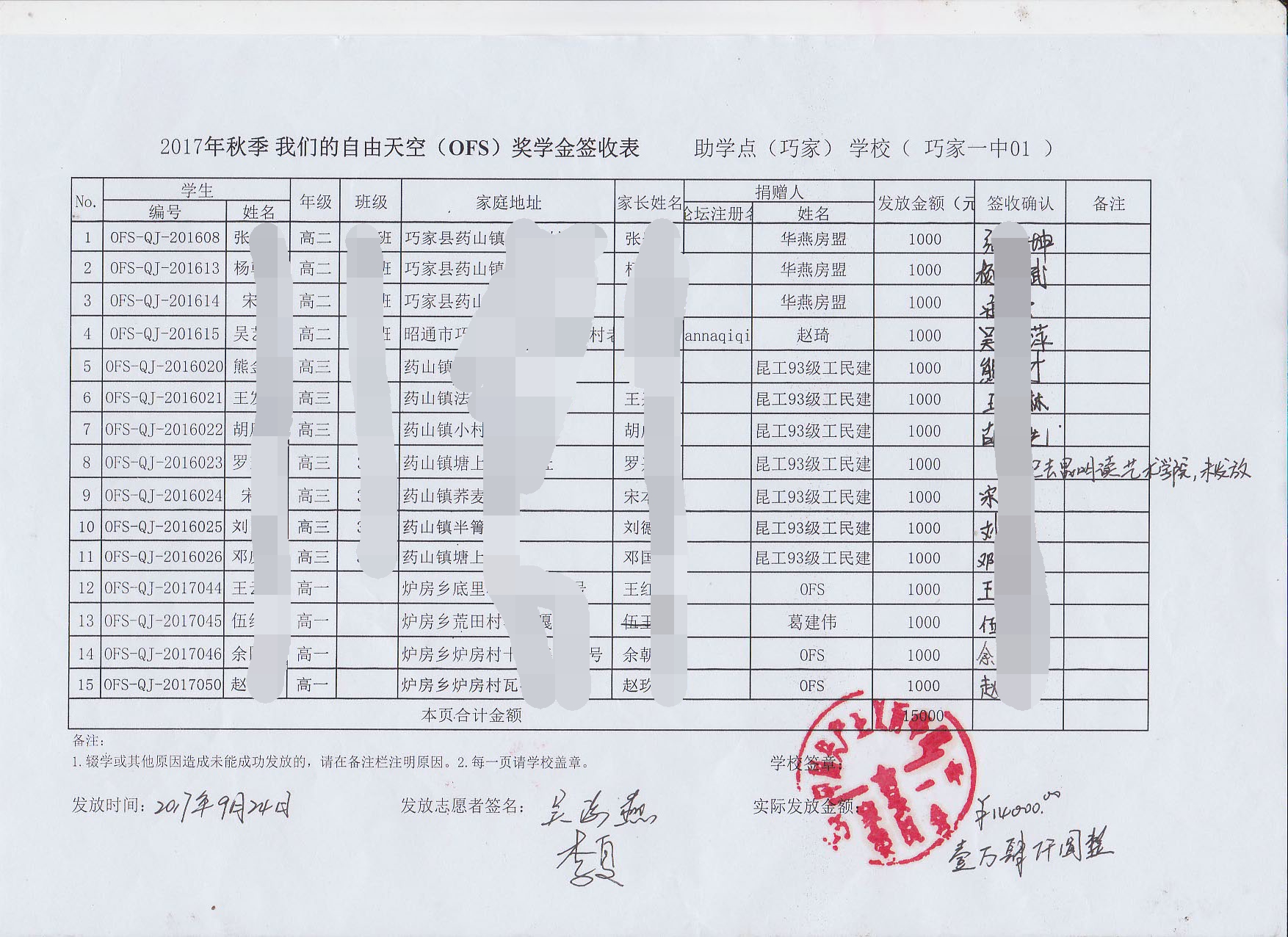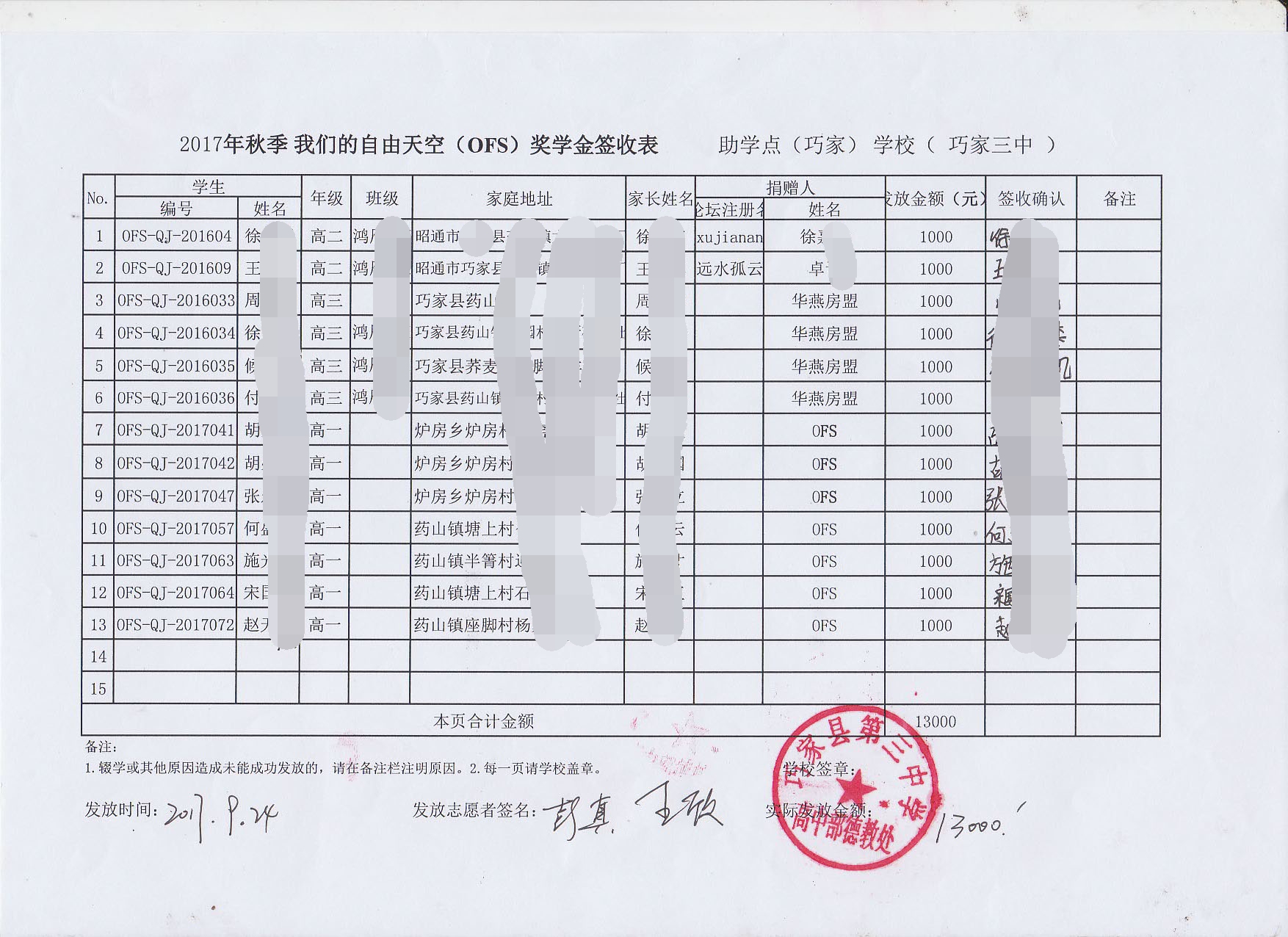 OFS志愿者历经5天的走访完成了秋季助学款和奖学金的发放工作,具体发放情况如下: d%.|MAE