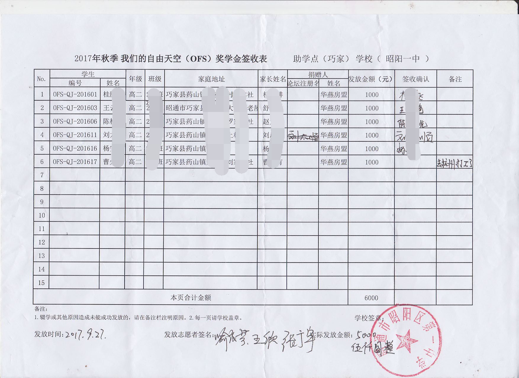 (为保护孩子权益计,孩子的真名和学校在公示中隐去,原版文件将发到各资助人邮箱,如有疑问可发送邮件到:qiaojia@ourfreesky.orgkids@ourfreesky.org) 6 Ia HaV+P