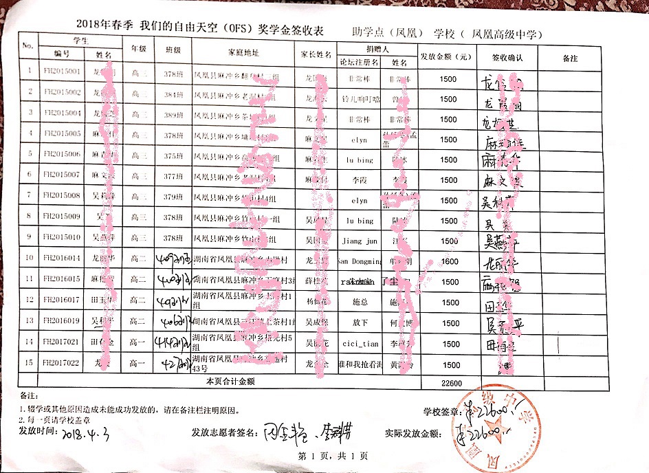 2018年4月2日—4月4日,由刘队长带领的七位娘子君完成了2018年凤凰春季奖学金及部分助学金的发放工作,计划发放29人,实际此次共发放6所学校28人(其中奖学金26人,助学金2人)共计发放41000元,其中有一名学生因自身原因转至职高,特取消其初升高奖学金。具体如下: