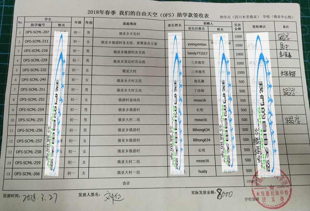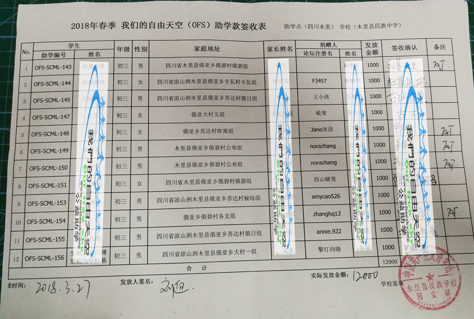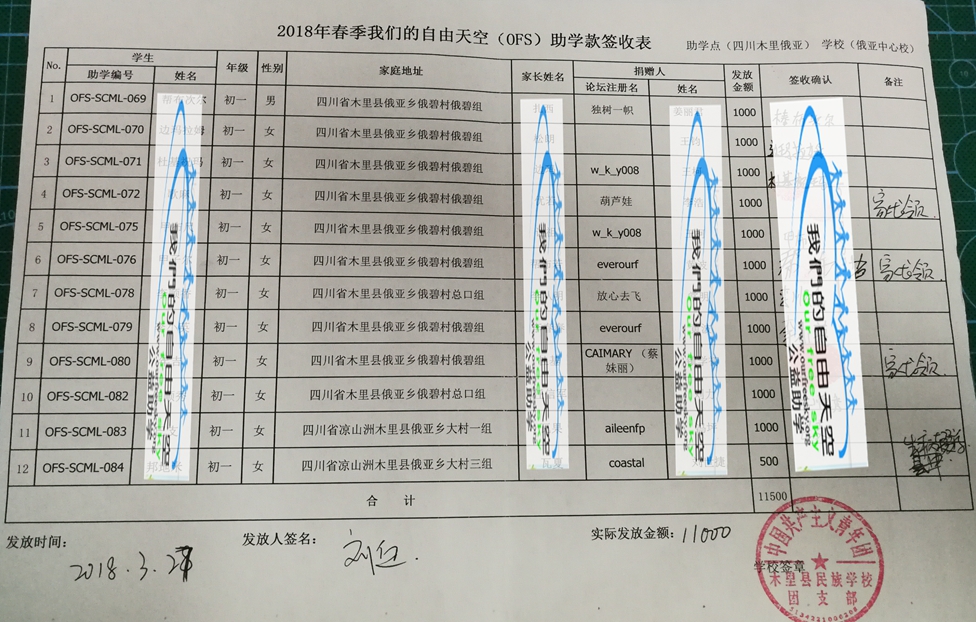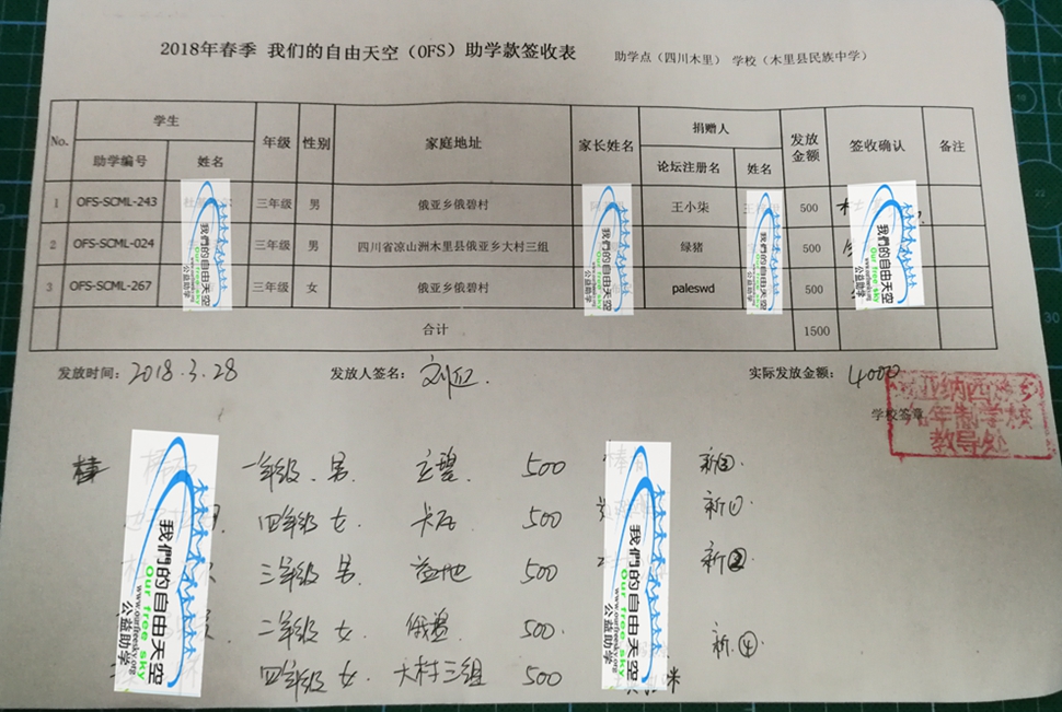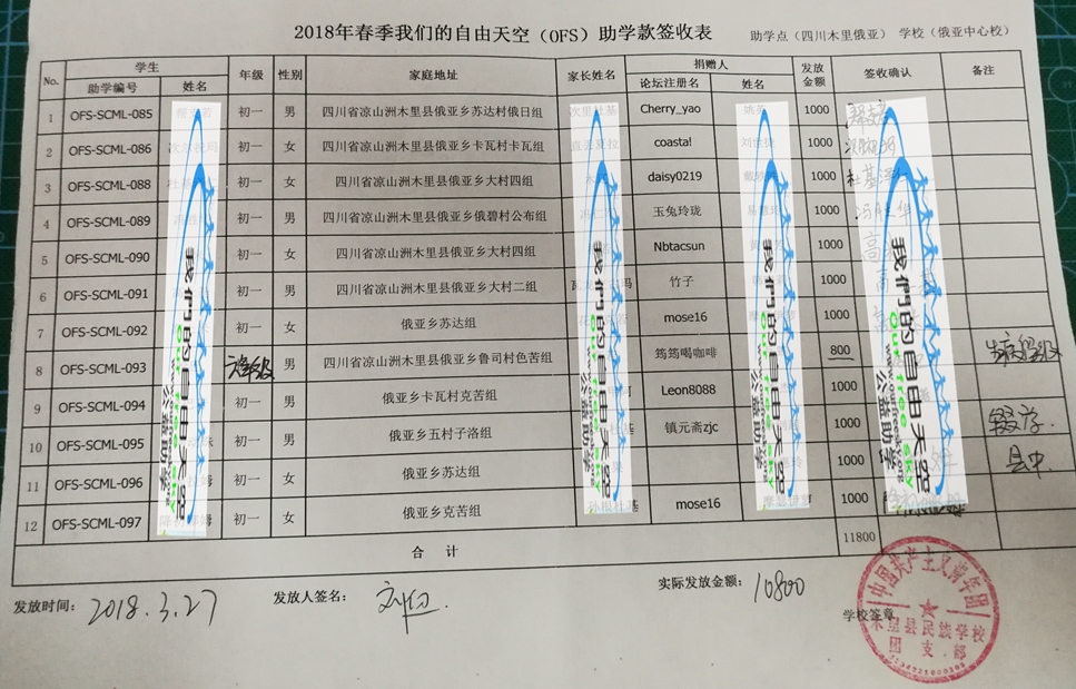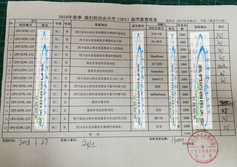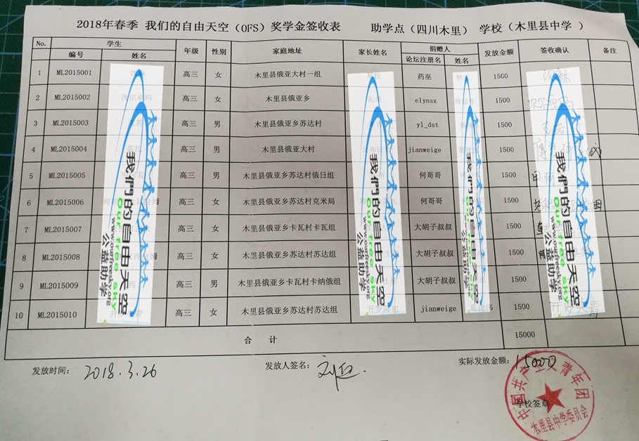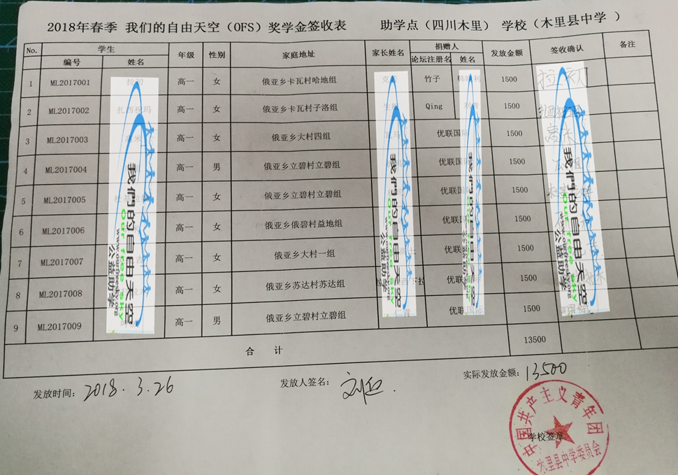 2018年3月24日西昌出发木里发放助学金、高中奖学金。高中奖学金28500元,初中助学金103000元,小学助学金53300元。 =PHIpFIuk