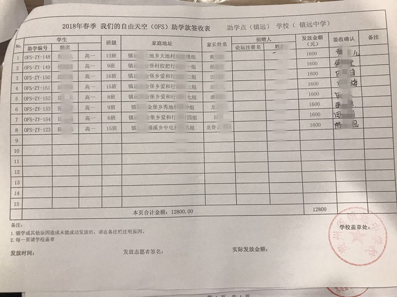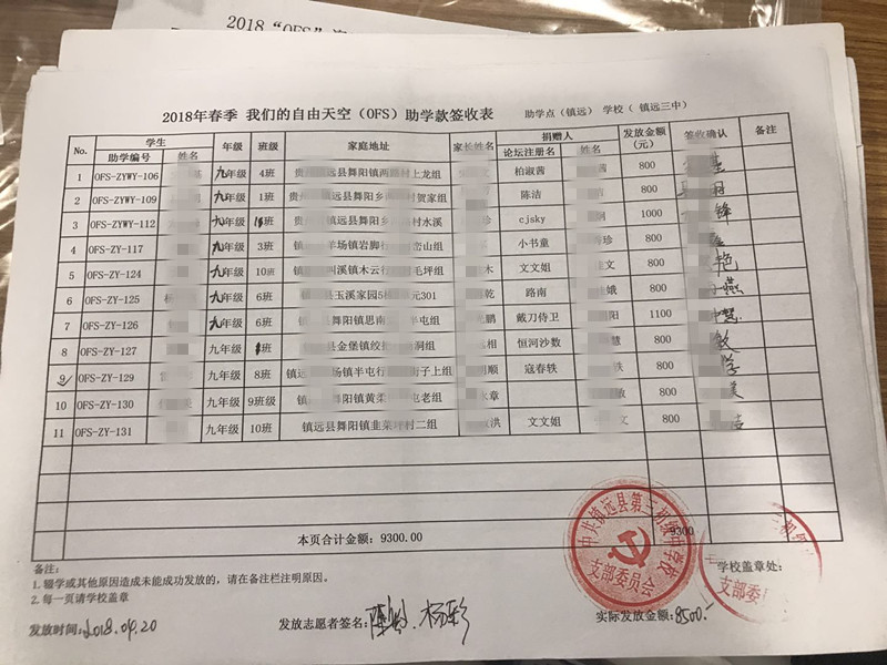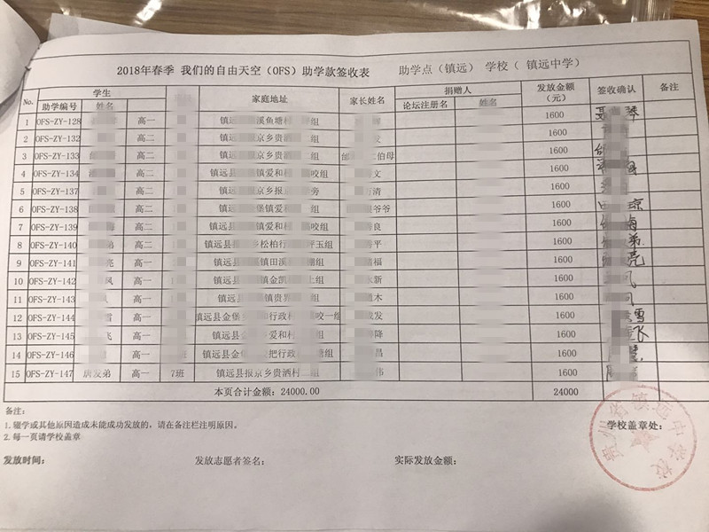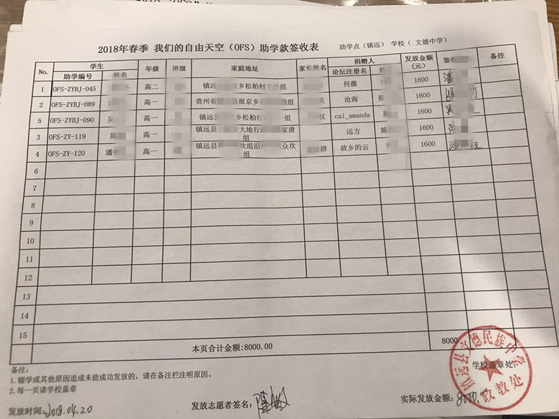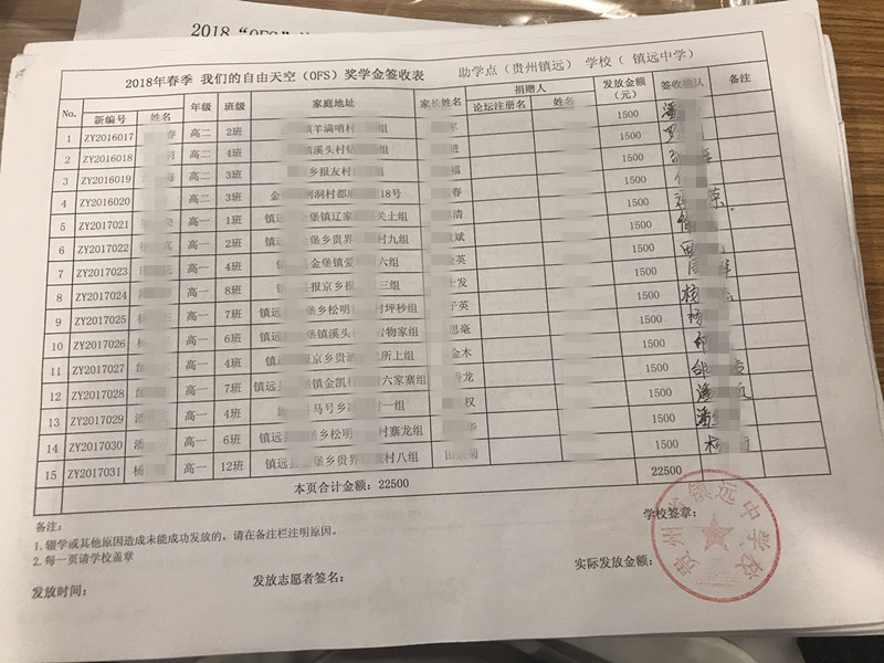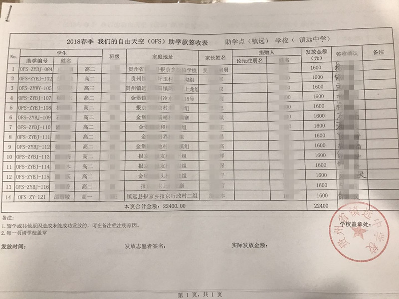 2018年4月18--20日,经过OFS走访人员走访,在贵州镇远共发放奖学金学生30人,金额为45000元;助学金学生53人,金额为76500元,合计金额为:121,500元。在走访回来之后,镇远助学负责人会尽快把各个学生的资料发到资助人邮箱中。        为保护孩子权益计,孩子的真名和学校在公示中隐去,原版文件将发到资助人邮箱,如有疑问可发送邮件到:zhenyuan@ourfreesky.orgkids@ourfreesky.org,现将签收表公示如下: