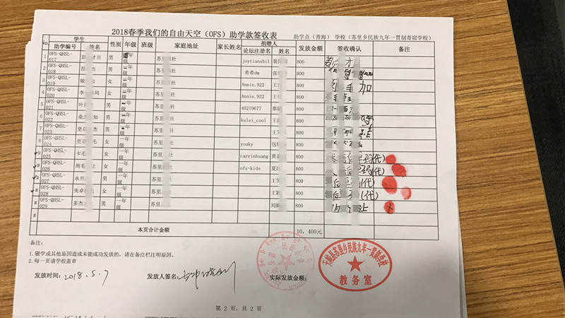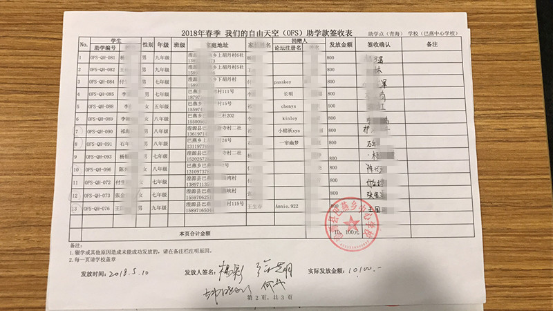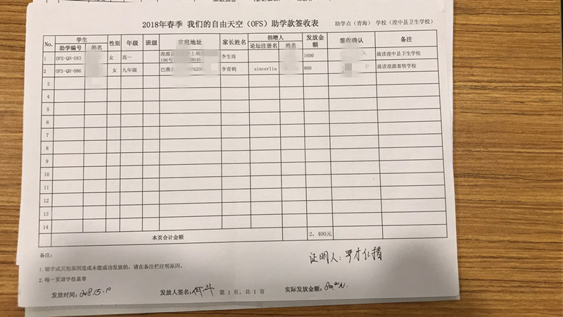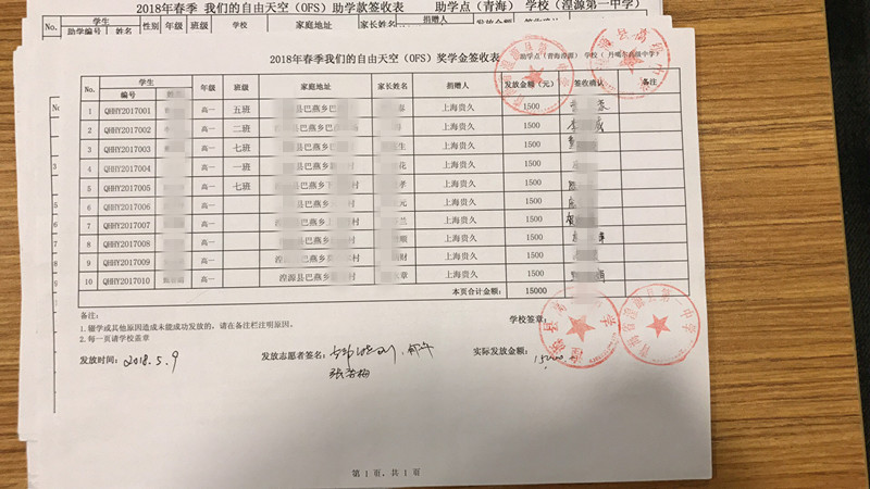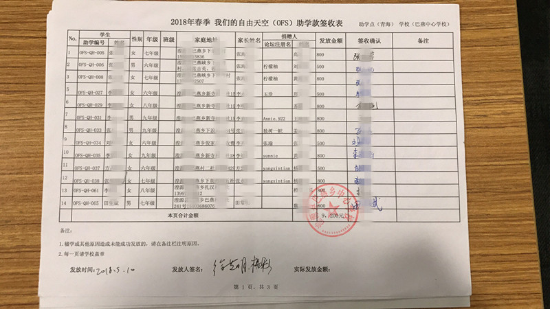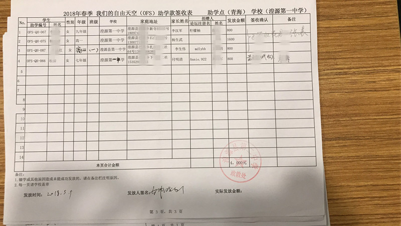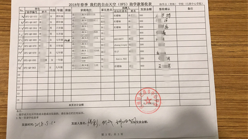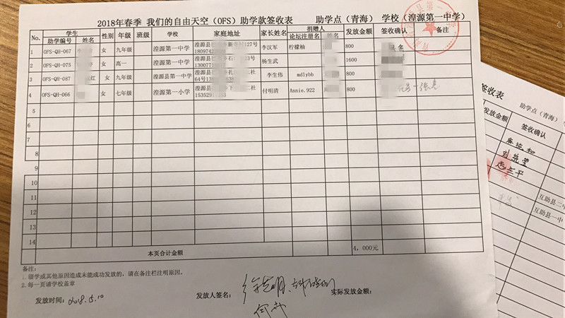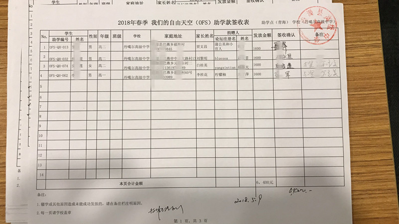 为保护孩子权益计,孩子的真名和学校在公示中隐去,原版文件将发到资助人邮箱,如有疑问可发送邮件到:qinghai@ourfreesky.orgkids@ourfreesky.org,现将签收表公示如下。