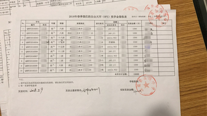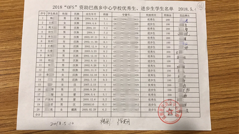 2018年5月5——10日,OFS在青海湟源县为20名学生发放奖学金30,000元;助学金95人73,100元;中山奖学金20人,3000元;合计总发放金额为106,100元.