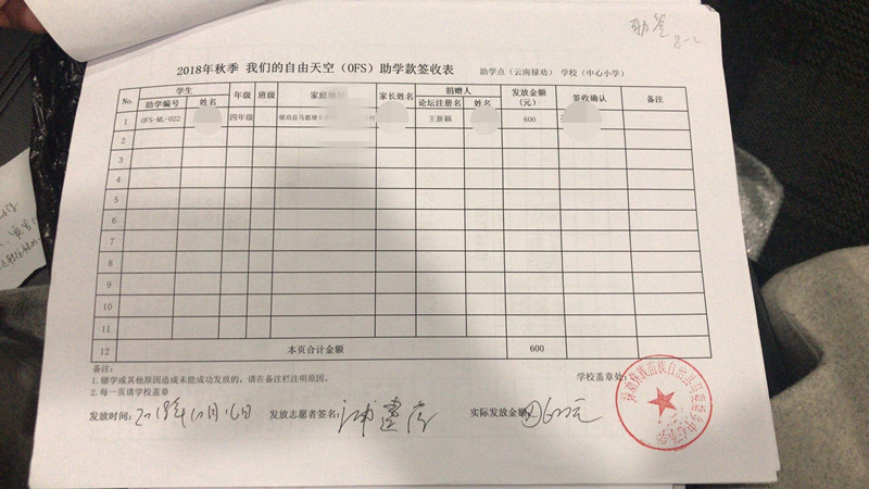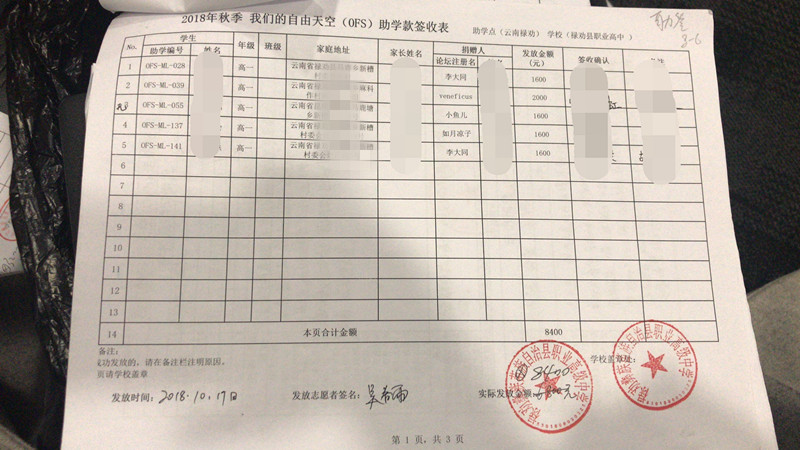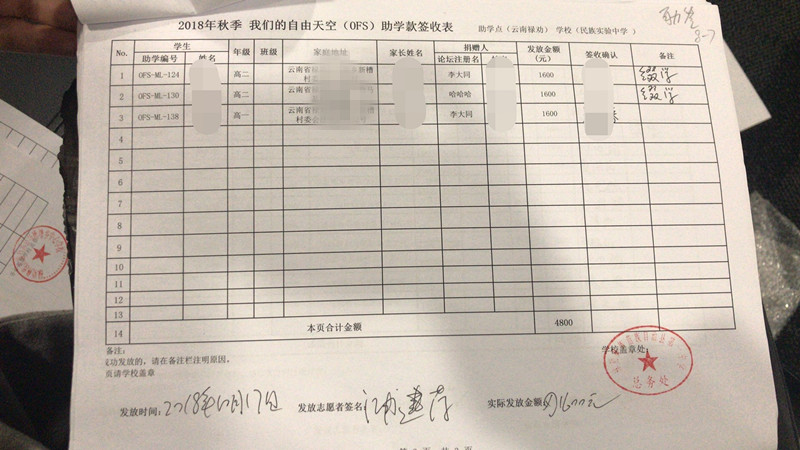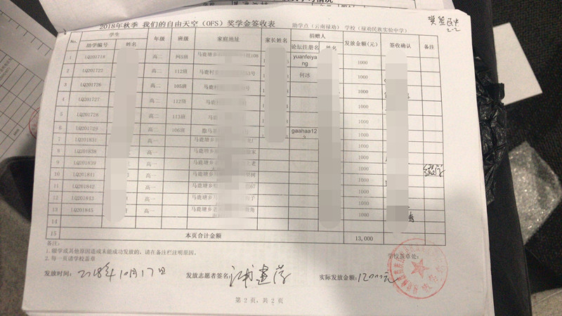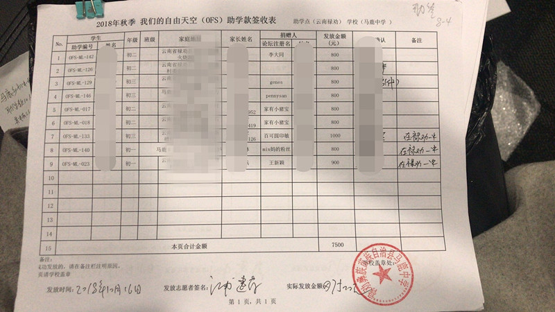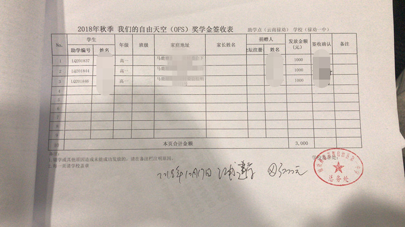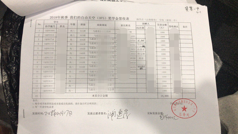 为保护学生隐私,签收表抹去学生姓名,学生资料已经发送到资助人邮箱,如有疑问,请咨询luquan@ourfreesky.org或者kids@ourfreesky.org g1(`a`M