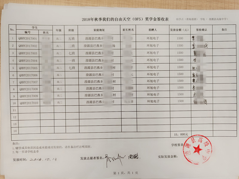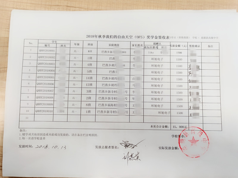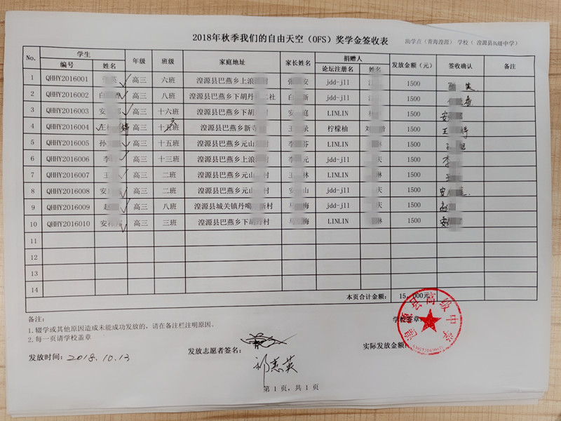 为保护学生隐私,签收表抹去学生姓名,学生资料将发送到资助人邮箱,如有疑问,请咨询qinghai@ourfreesky.org,或者kids@ourfreesky.org