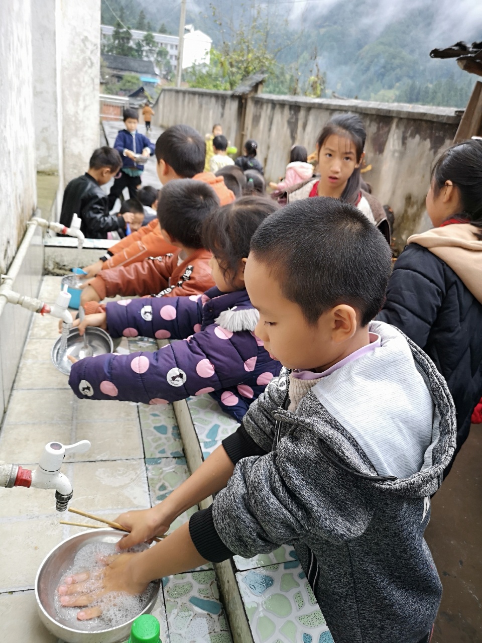 先到上岩完小找熟悉学生家里情况的老师陪同我们家访。要开半个多小时山路,文老师技术好,又快又稳!到达后要爬上一段叫狮子坡的小路才能进入学校。学生们非常有礼貌,主动打招呼,一点儿也不怯场。到了午饭时间,乡下没有吃饭的地方,午餐是和同学们一起吃的。
