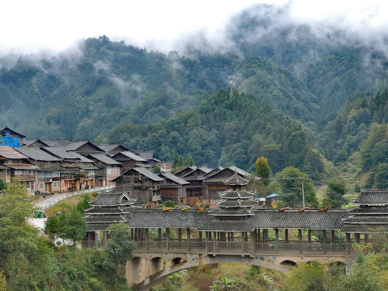 我们沿着崎岖的山路行进,连绵的阴雨使道路湿滑泥泞,山路弯弯,视线不好,途中不停地提醒司机减速、慢行、鸣笛。沿途重峦叠嶂,云雾缭绕,一个个古村落路旁闪过,目不暇接,美不胜收。