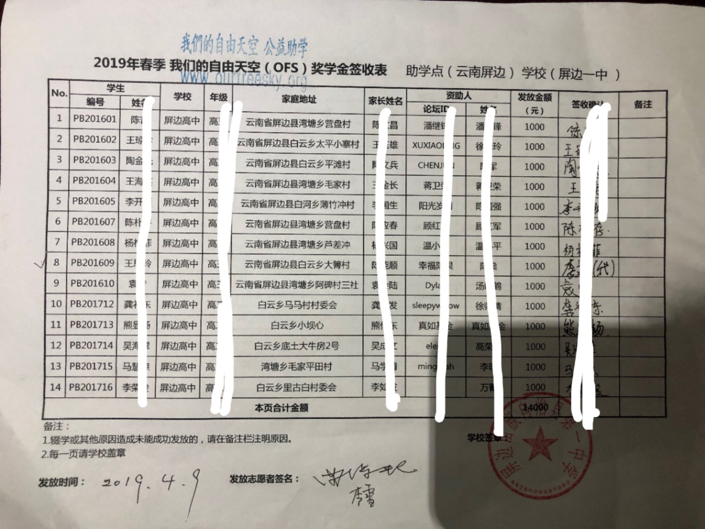 为保护学生隐私,签收表抹去学生姓名,学生资料待整理好后发送到资助人邮箱,如有疑问,请咨询pingbian@ourfreesky.org,或者kids@ourfreesky.org