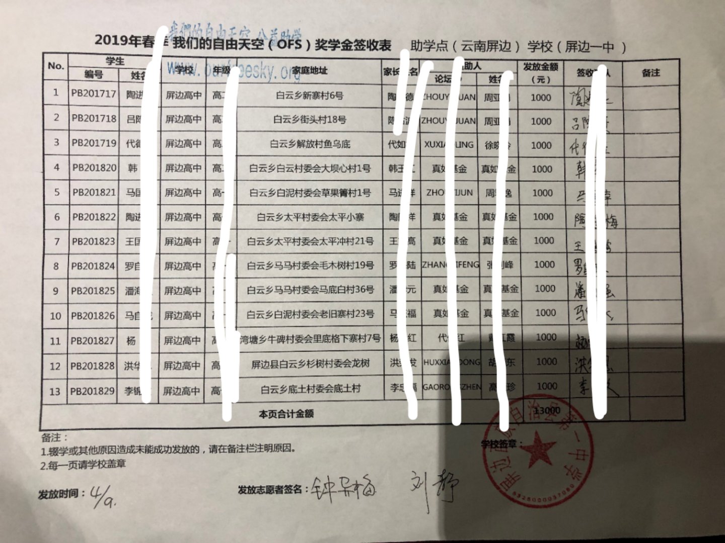 云南屏边2019年春季秋季助学款发放于2019年4月10-12日,顺利发放完毕,走访志愿者为7人;