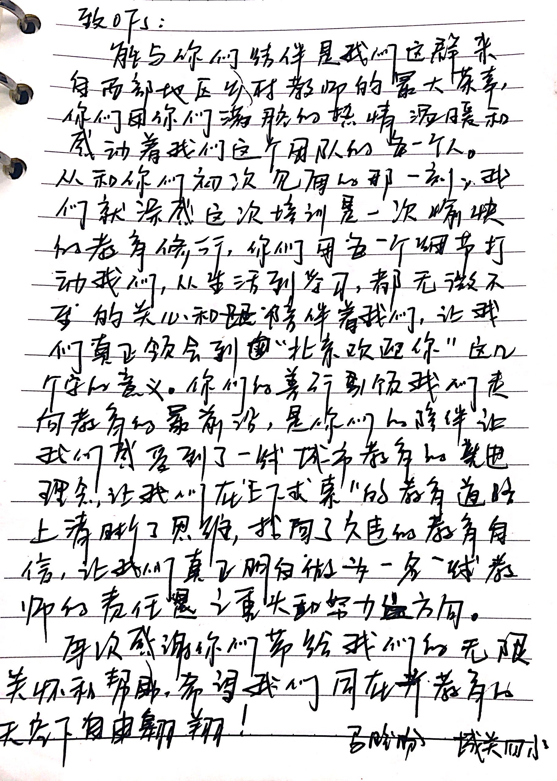 能与你们结伴是我们这群来自西部地区乡村教师的最大荣幸,你们用你们满腔的热情温暖和感动着我们这个团队的每一个人。从而和你们初次见面的那一刻,我们就深感这次培训是一次愉快的教育修行,你们用每一个细节打动我们,从生活到学习,都无微不至的关心和陪伴着我们,让我们真正领会到“北京欢迎你”这几个字的意义。你们的善行引领我们走向教育的最前沿,是你们的陪伴让我们感受到了一线城市教育的先进理念,让我们再:上下求索“的教育道路上清晰了思维,找回了久违的教育自信,让我们真正明白作为一线教师的责任之重大和努力方向。