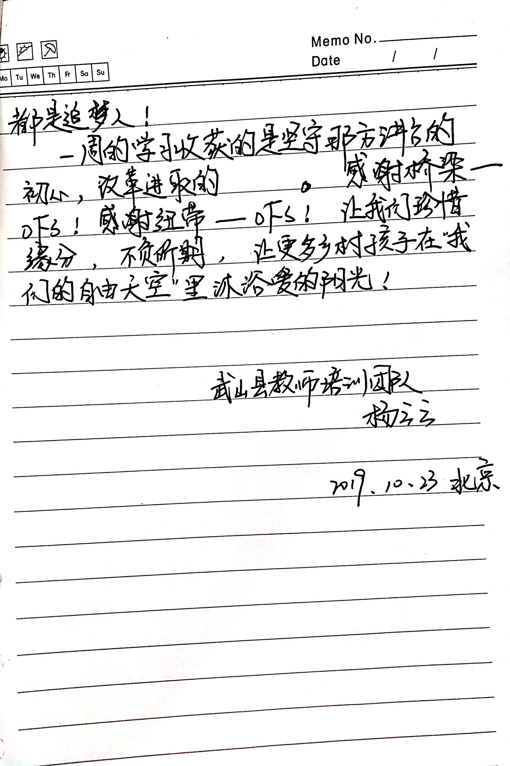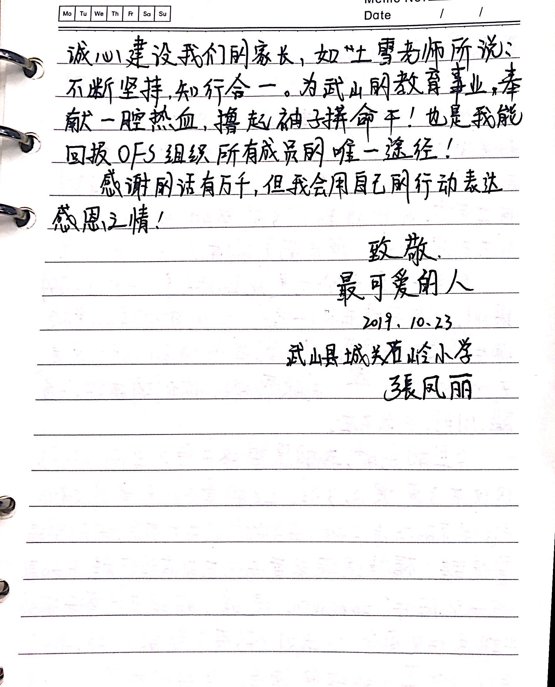 今年的此时,我的愿望终于得已实现,对OFS组织有了更深的了解。年长的常老师和惠文老师初到北京的接待安排,每日安排的井井有条,时刻的温馨提醒;精神饱满的黄老师在所有行程中如影随形的陪伴,如此贴心温暖。昨晚与土雪老师的中期总结见面会,让我对OFS有了新的认知。我们会将公益事业的情怀续承,会将公益事业的精神火把传承,我们更会不负众望,在OFS的搭建栽培下,回到本土,安心坚守,用自己所学所思,诚心建设我们的家长,如土雪老师所说:“不断坚持,知行合一。为武山的教育事业,奉献出一腔热血,撸起袖子拼命干!也是我能回报OFS组织所有成员的唯一途径!