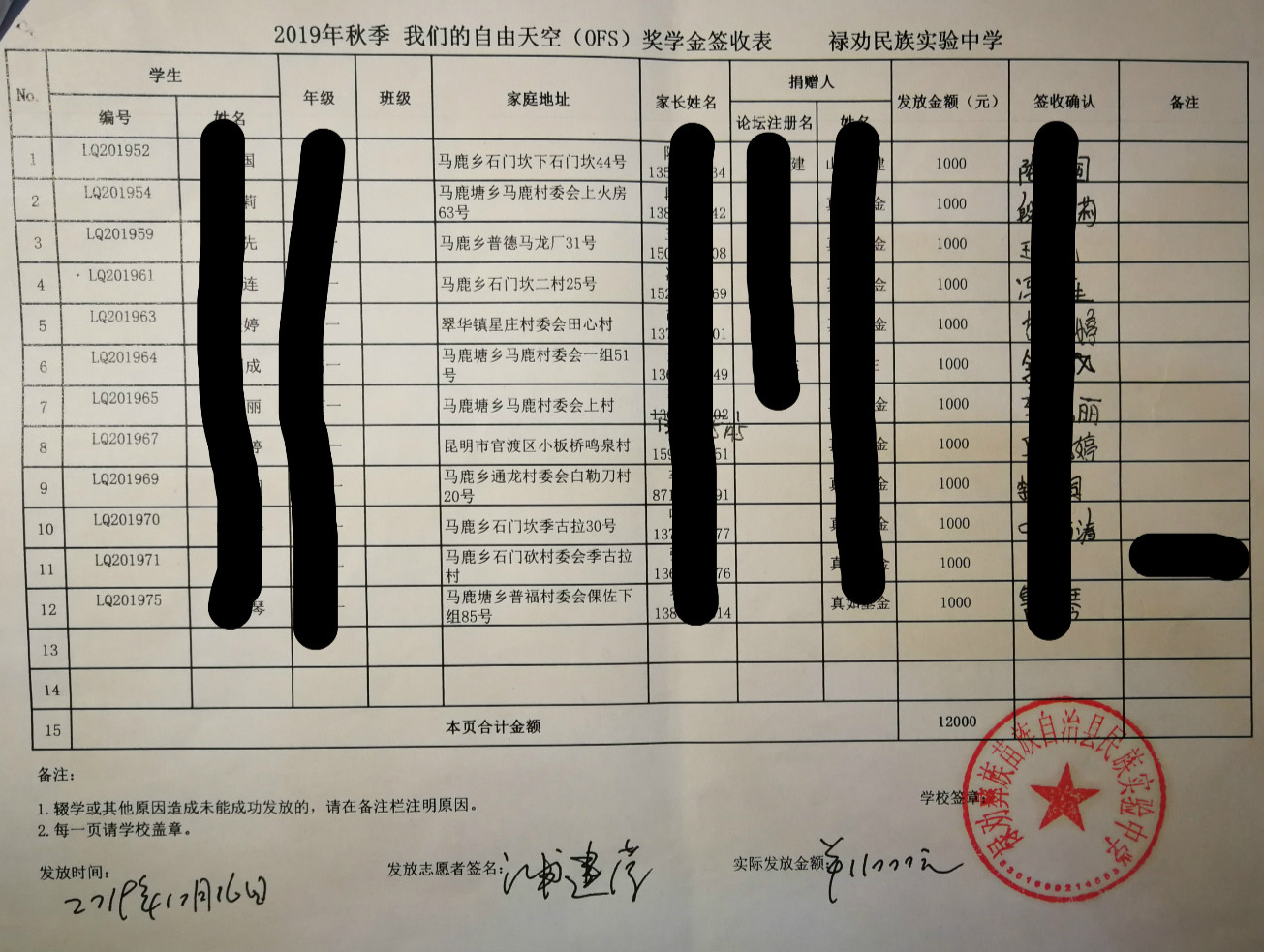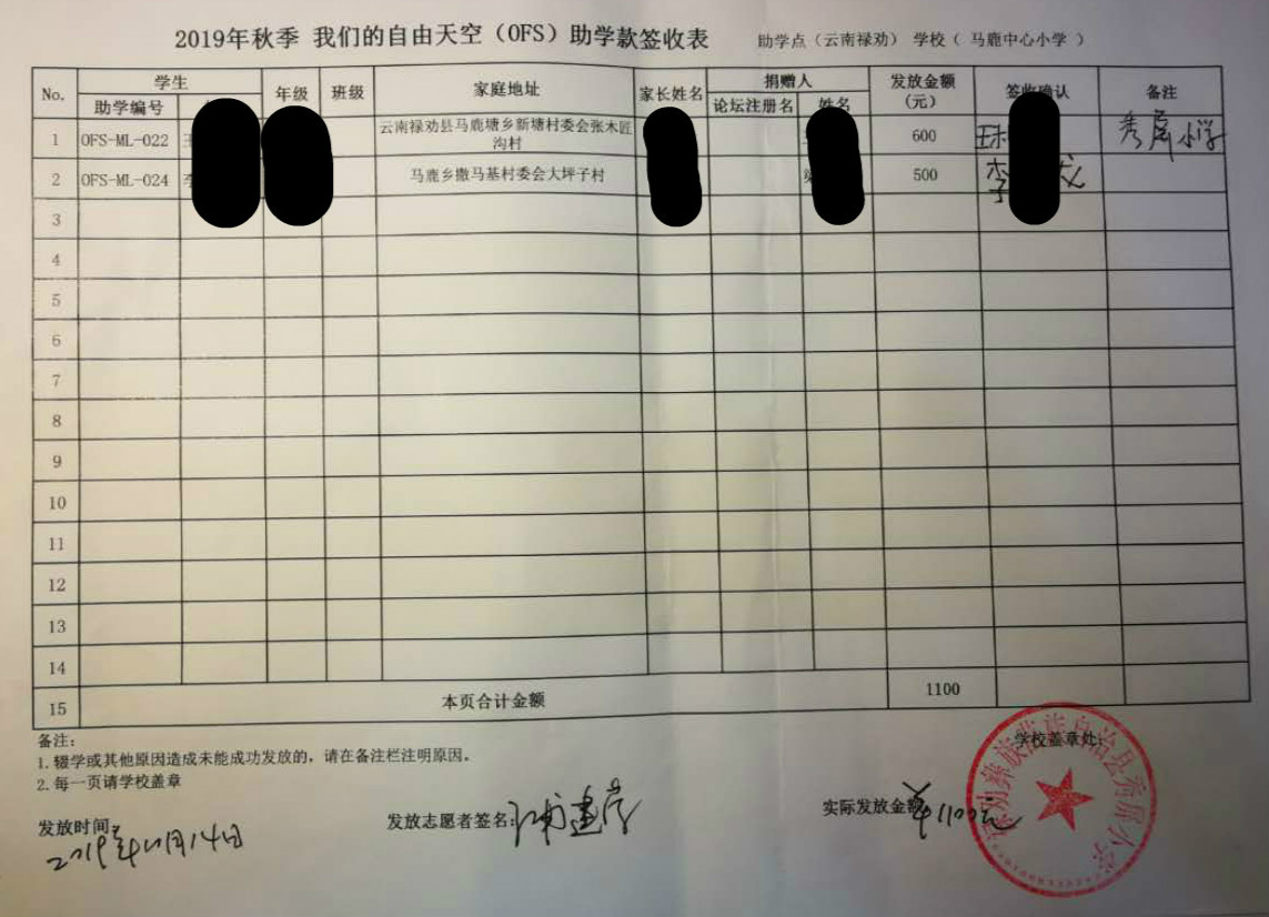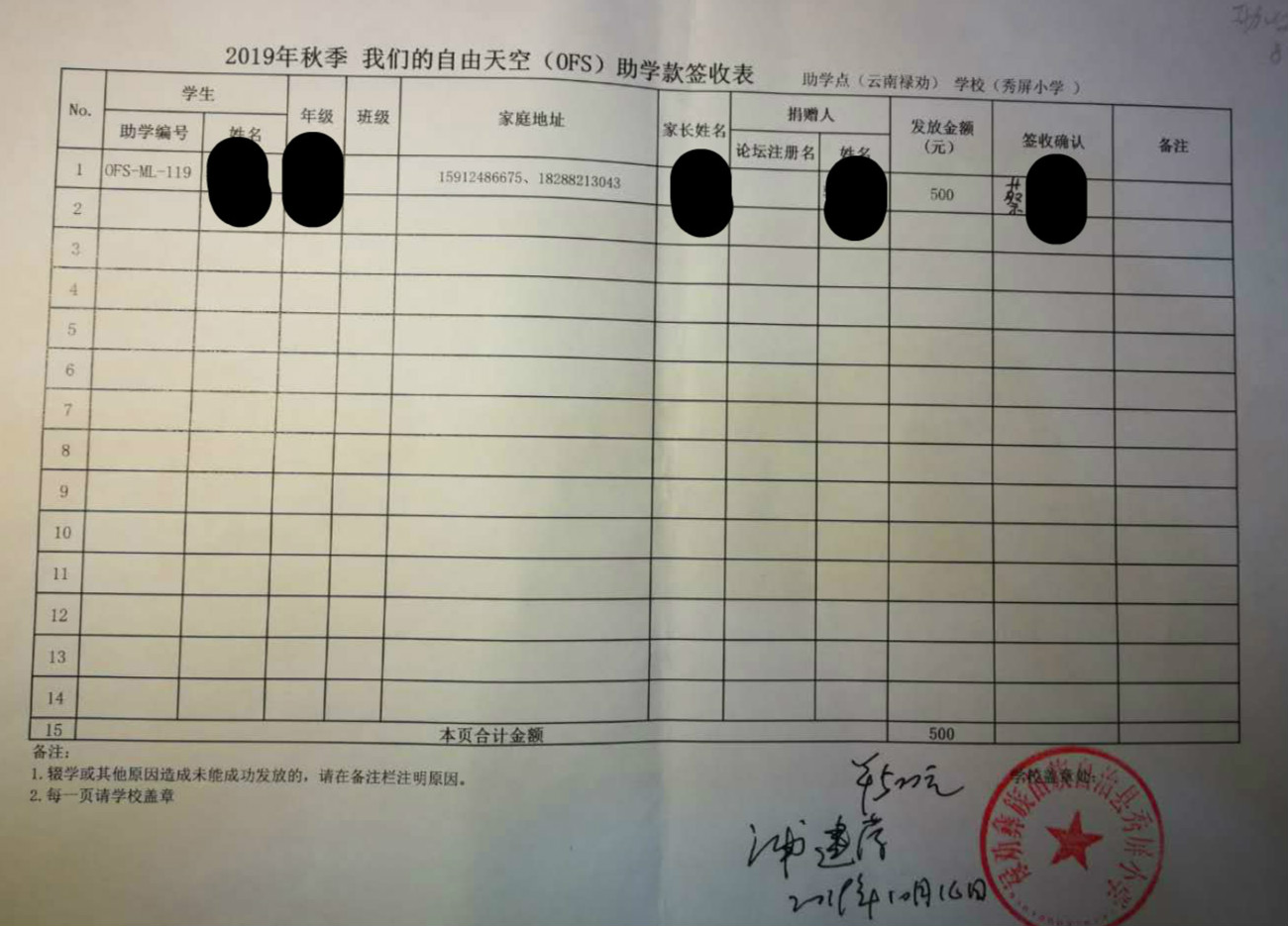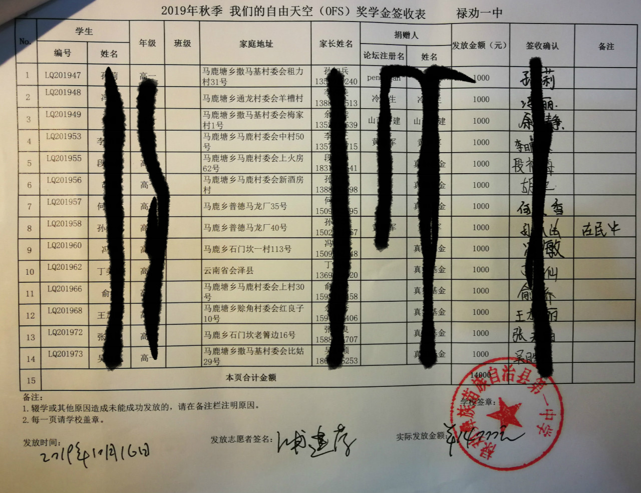 为保护学生隐私,签收表抹去学生姓名,学生资料已经发送到资助人邮箱,如有疑问,请咨询luquan@ourfreesky.org,或者kids@ourfreesky.org F]PsS(