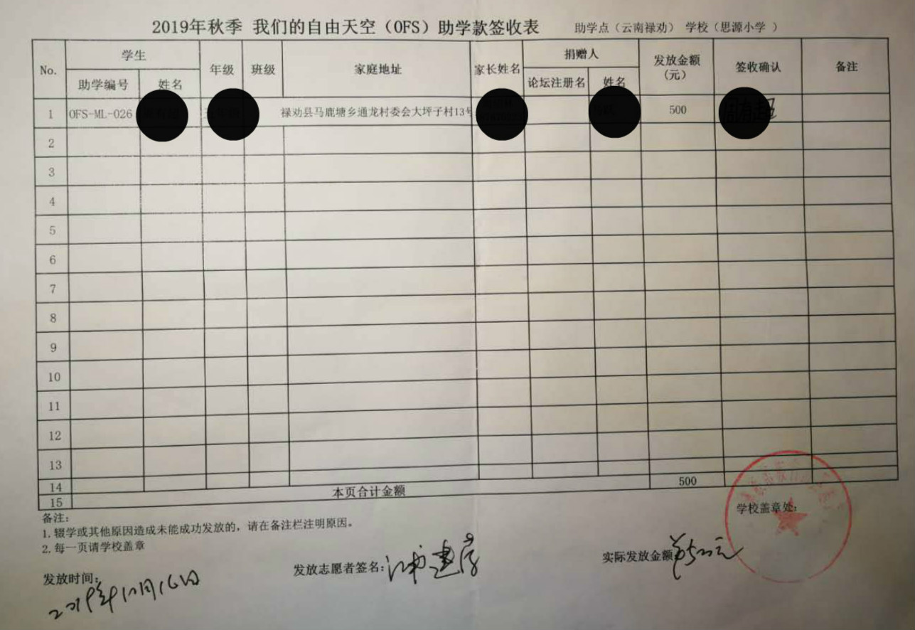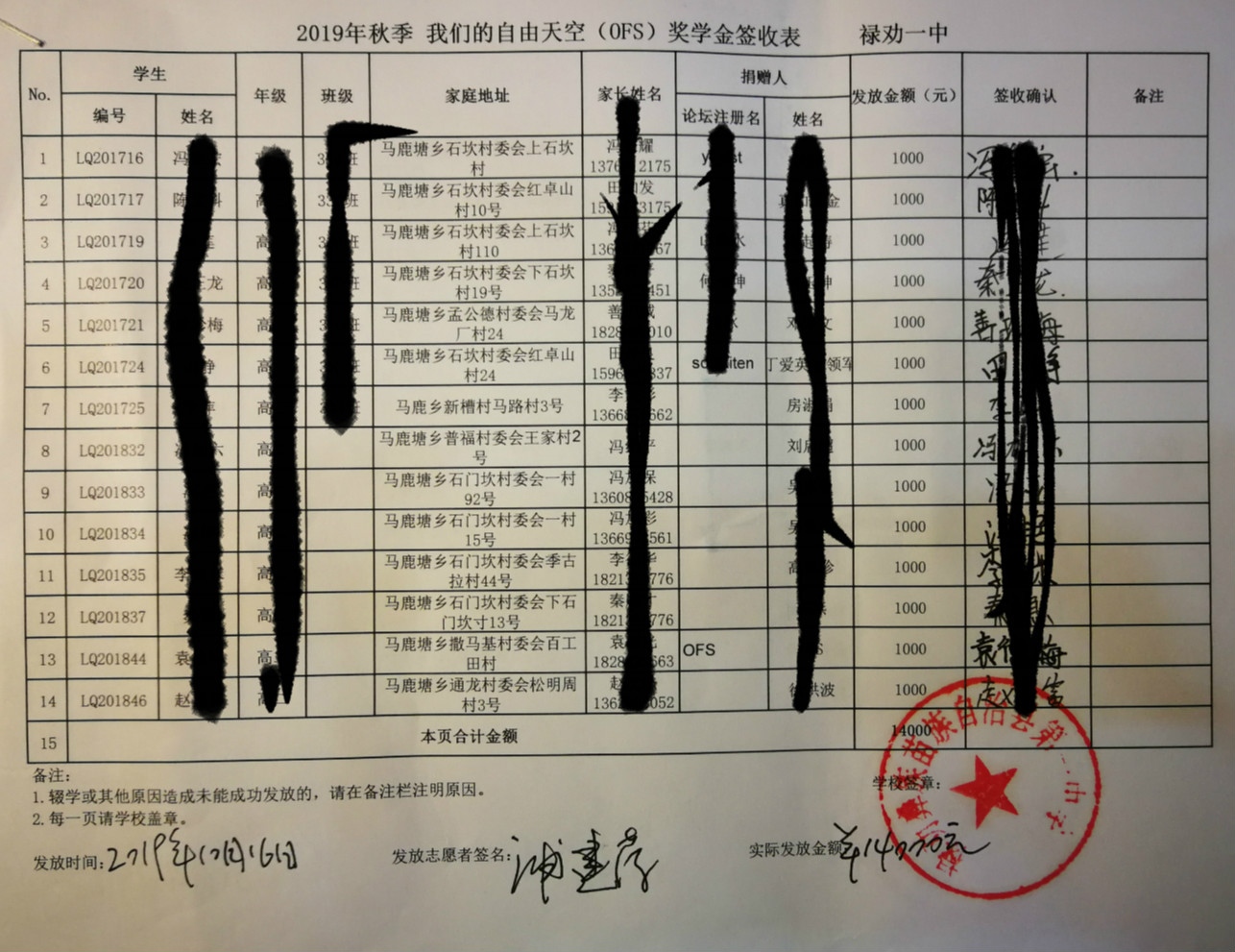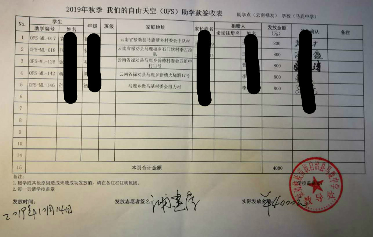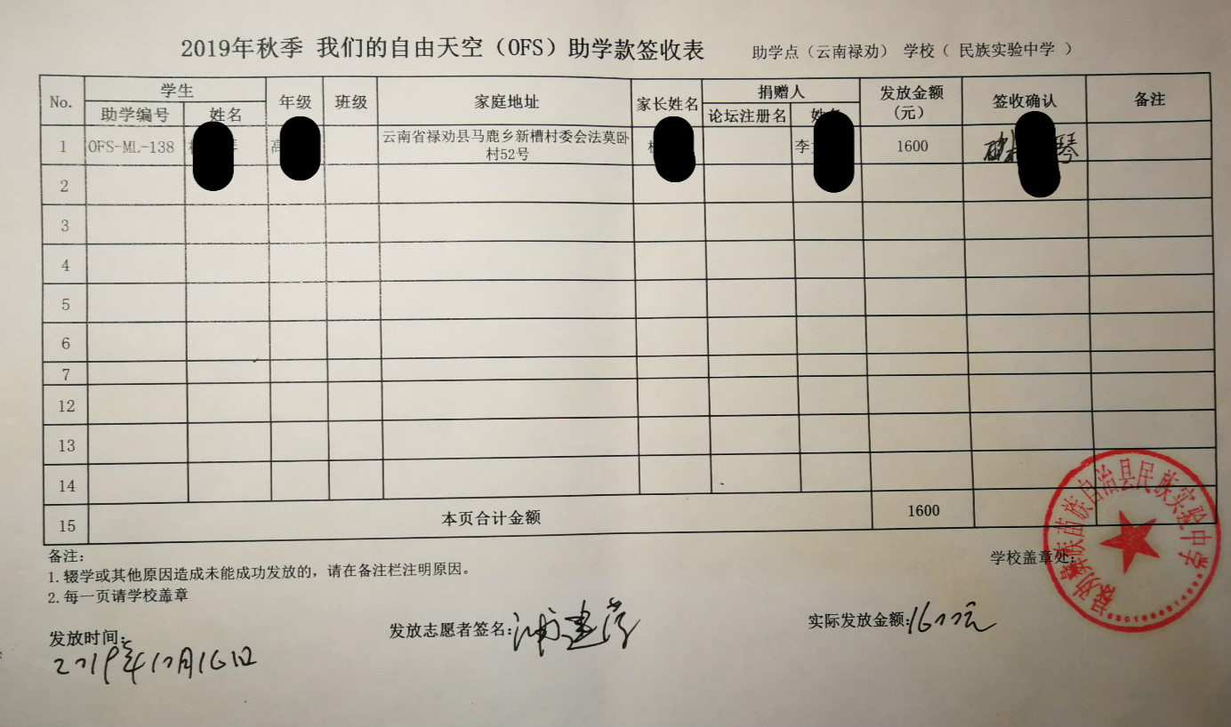 为保护学生隐私,签收表抹去学生姓名,学生资料已经发送到资助人邮箱,如有疑问,请咨询luquan@ourfreesky.org,或者kids@ourfreesky.org F]PsS(