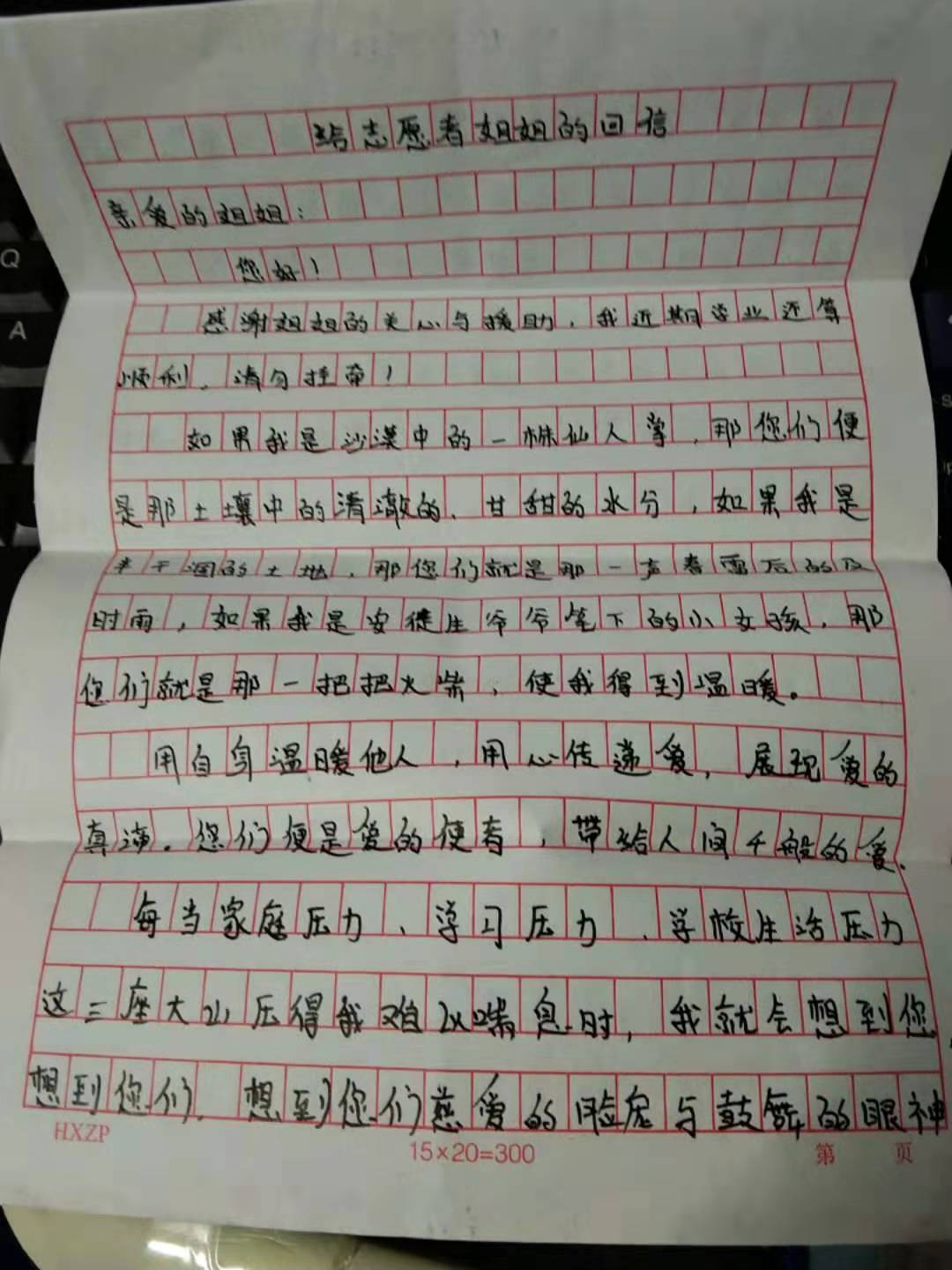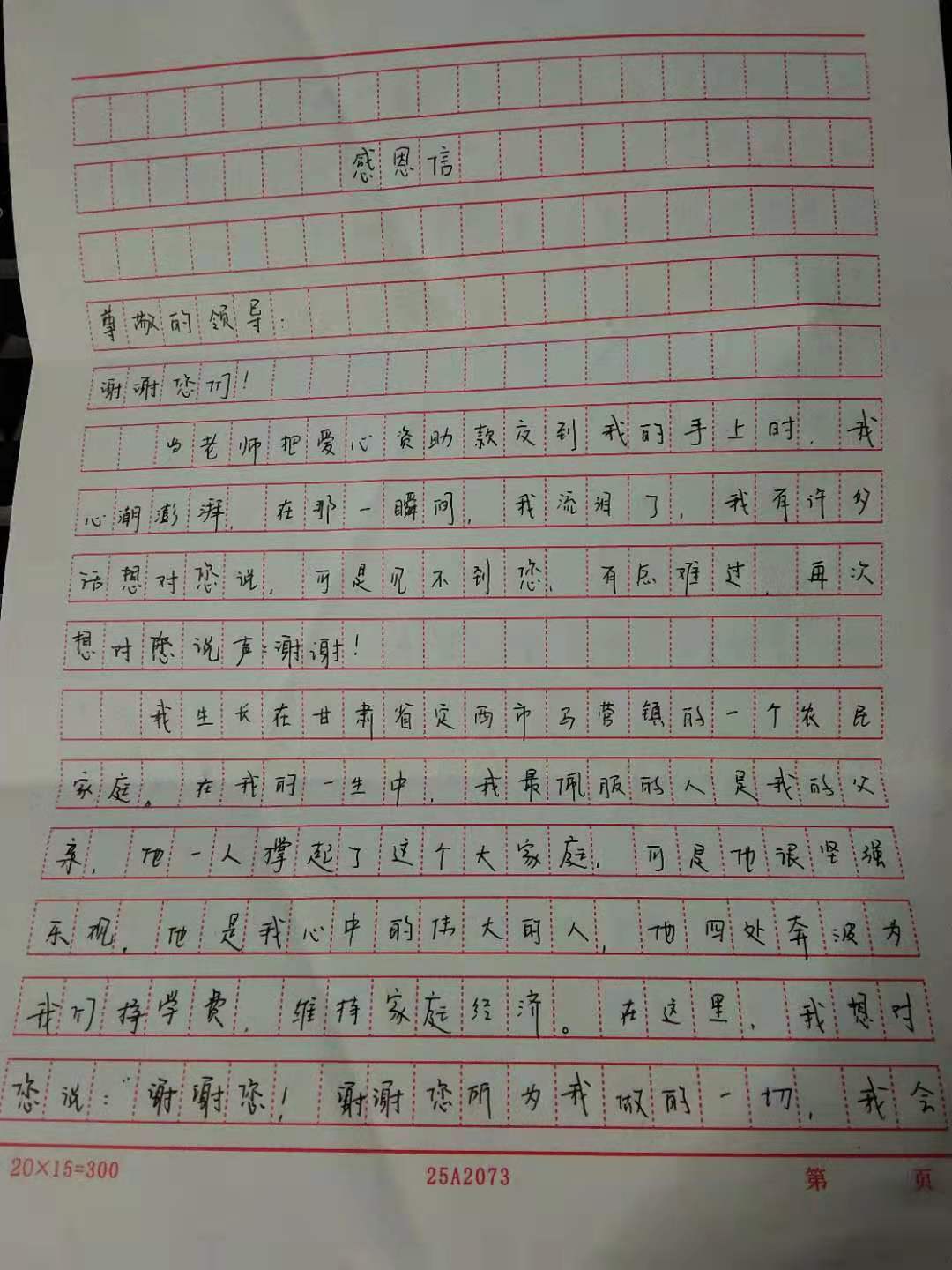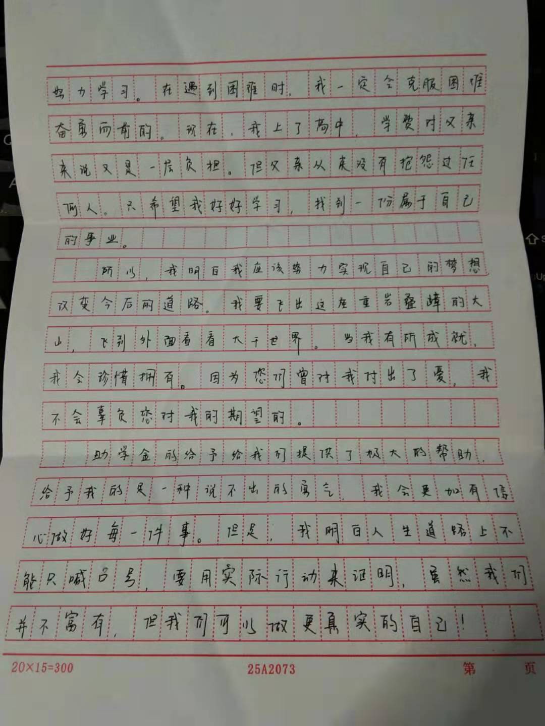 每当家庭压力、学习压力、学校生活压力这三座大山压得我难以喘息时,我就会想到您,想到您们,想到你们慈爱的脸庞与鼓舞的眼神。这时,我又会重拾自信,继续向前。因为每当想到您们,我就不再觉得自己是孤军奋战。我有您们的帮扶,您们的帮扶不只是物质的,更是精神上的。您们无私奉献的精神是我最大的鼓舞与启迪。您们不辞艰辛为莘莘学子送学金让我震奋,时常对自己说:“不要犹豫,不要畏惧!勇敢冲向大海吧!即使大浪会把你吞没!”用有限的生命创造出无限的价值,燃烧自己照亮别人这便是我今后努力的方向。