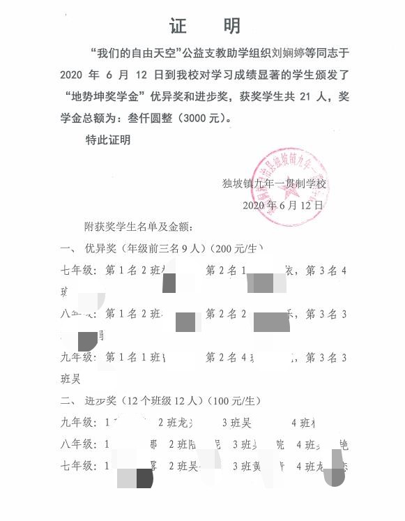 为了帮助偏远山区的孩子,在通道县独坡中心校常年设立“地势坤奖学金”,主要发放对象为年级前三名的优秀学生和每班的一名进步学生。