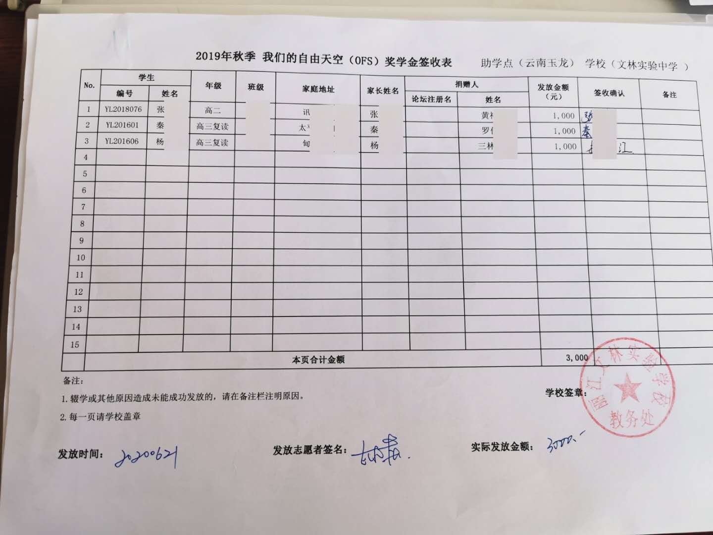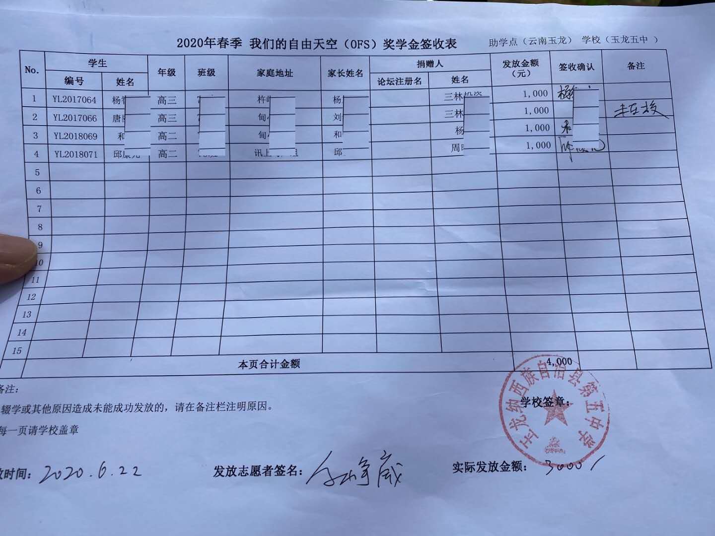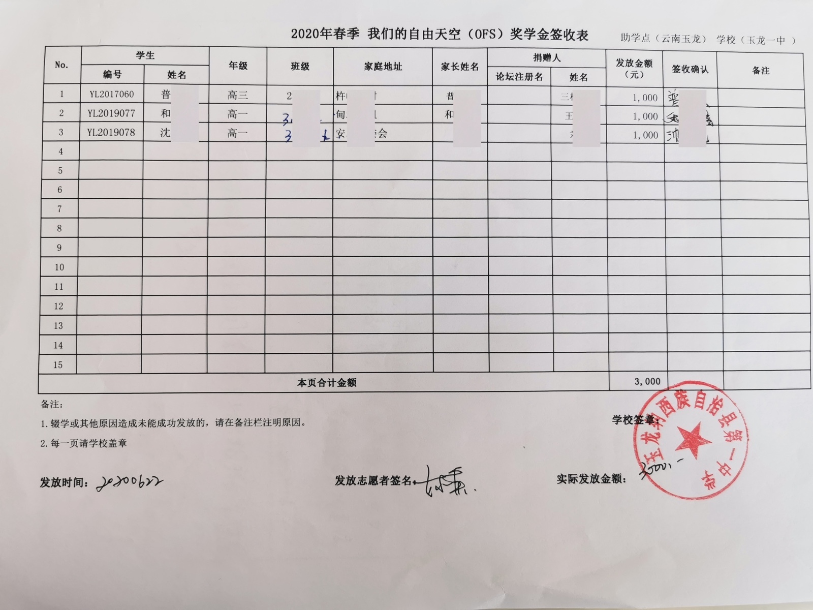 OFS走访志愿者在2020年6月21日-23日对云南省丽江市玉龙纳西族自治县及鲁甸乡助学点进行了走访工作,本帖针对玉龙助学点助学款发放工作做具体阐述。   + O'3|M