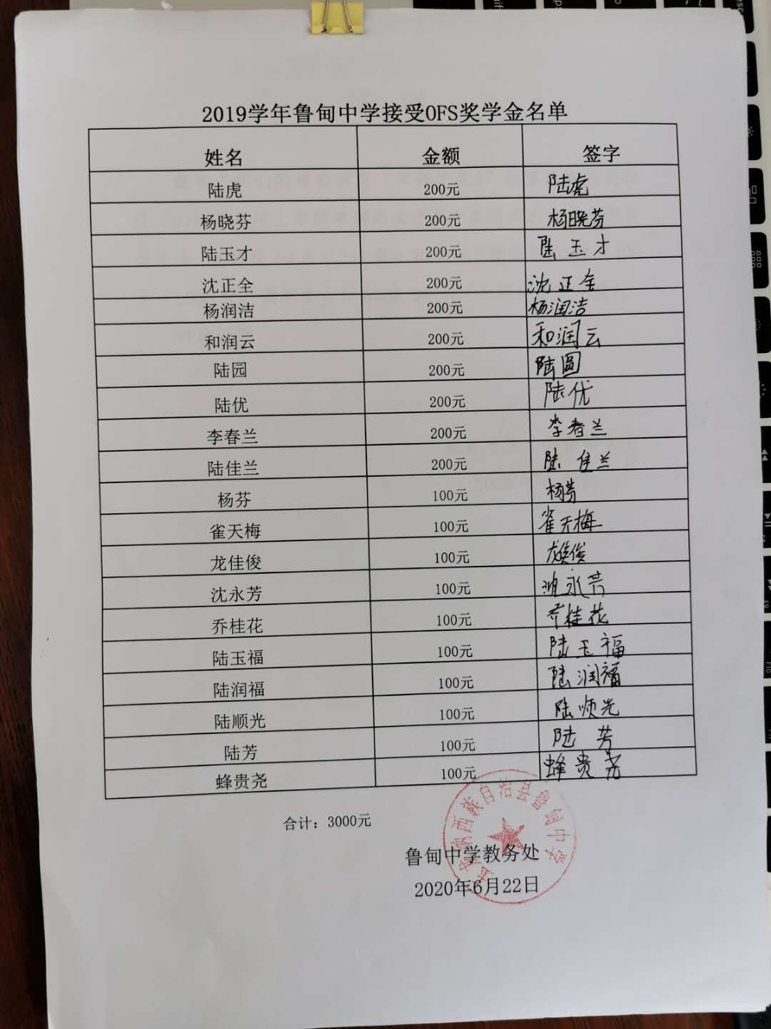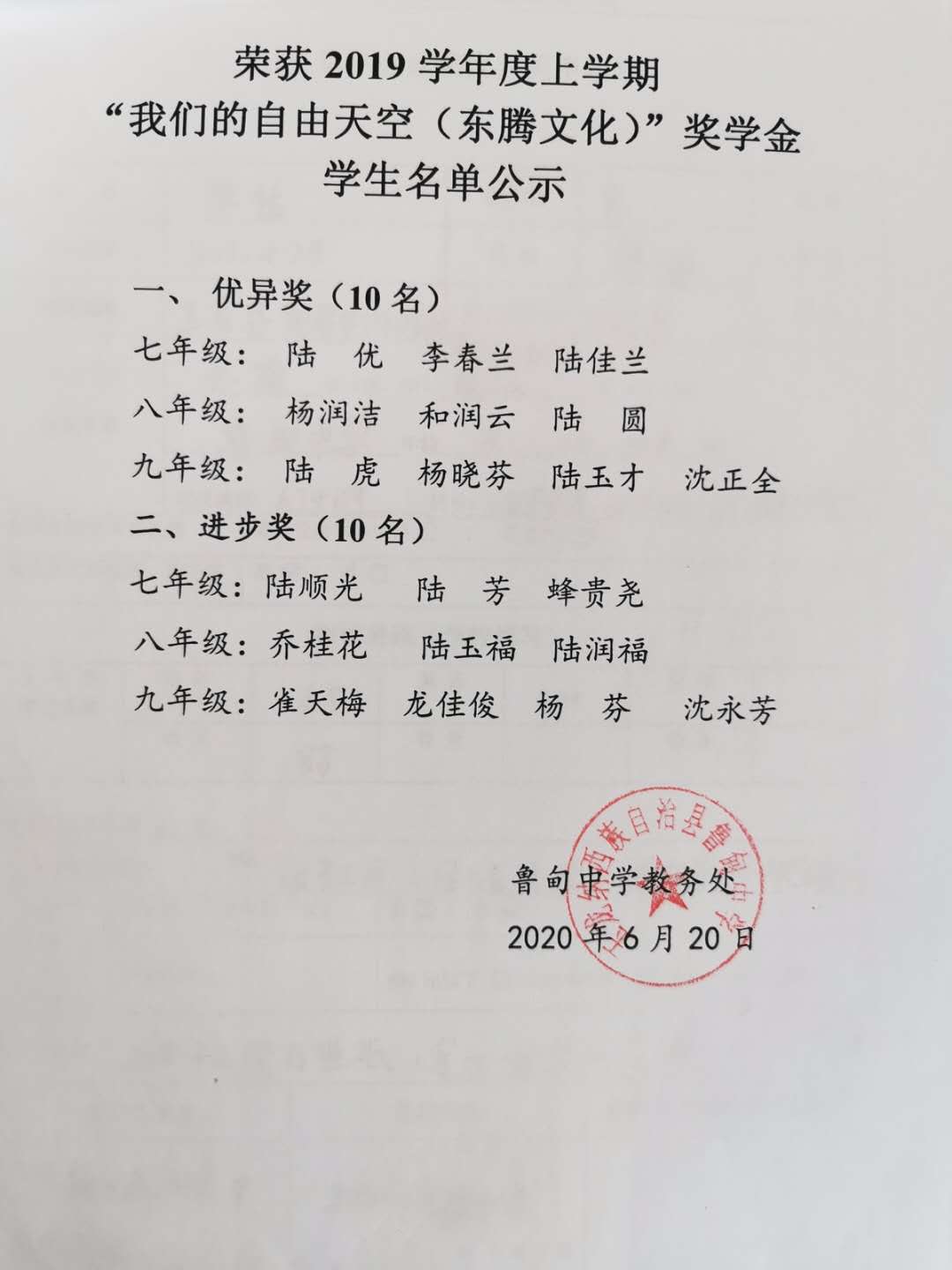 “东腾文化奖学金”奖励基金作为鲁甸中学奖学金项目的常设基金,2019学年下学期获奖学生名单及奖金发放情况如下: ]}n|5