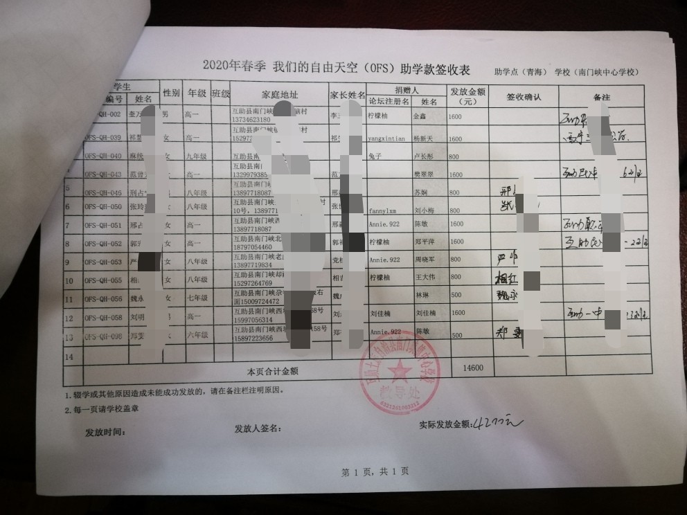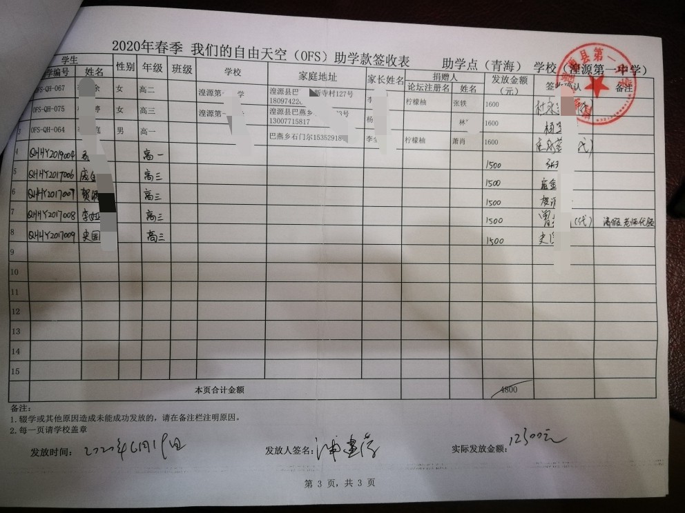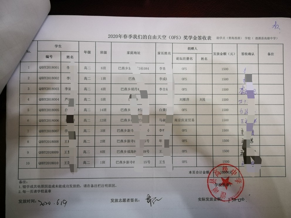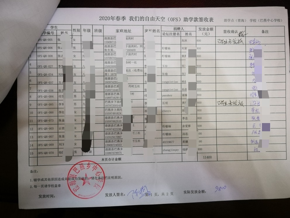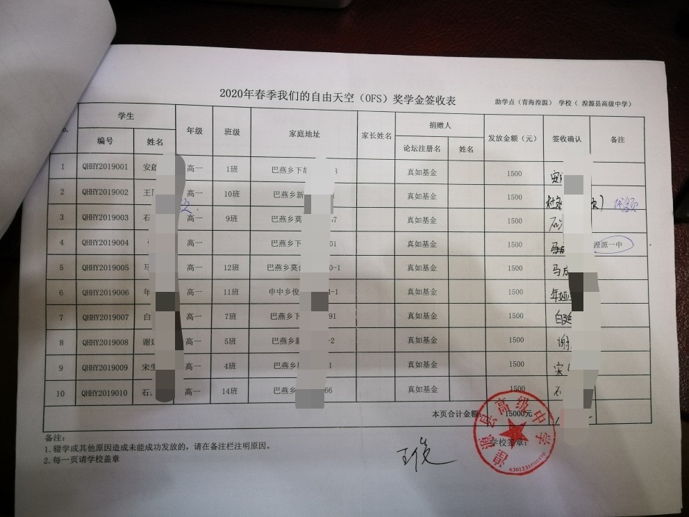 青海省湟源、互助县2020年春季助学款发放于2020年6月19-21日,发放完成.(本次由于疫情原因,很多学校都不让进入,有的是协调老师之后让老师发放,奖学金不让回访,因此无回访表,此外天峻无法进入,故留秋季发放。)