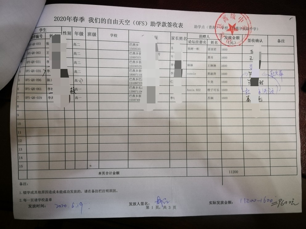 为保护学生隐私,签收表抹去学生姓名,学生资料将近期发送到资助人邮箱,如有疑问,请咨询qinghai@ourfreesky.org,或者kids@ourfreesky.org