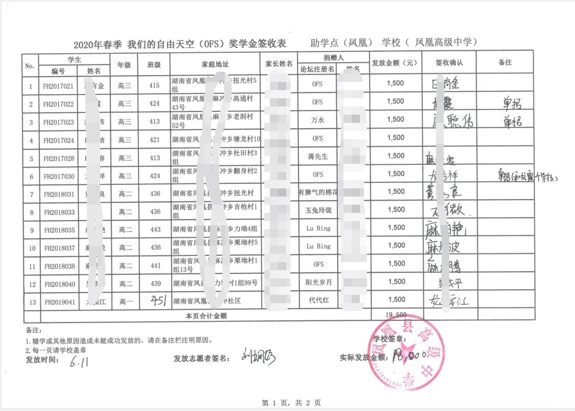 湖南凤凰2020年春季奖学金于6.10-6.11,顺利发放完毕。