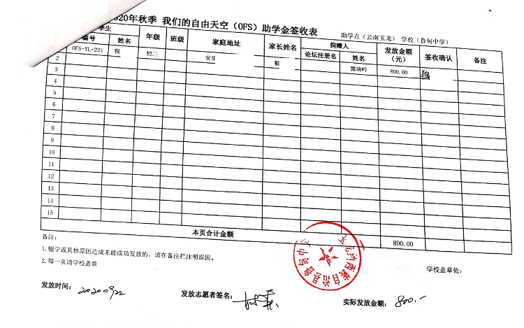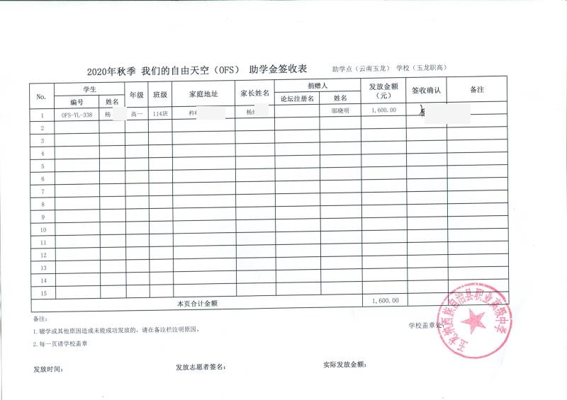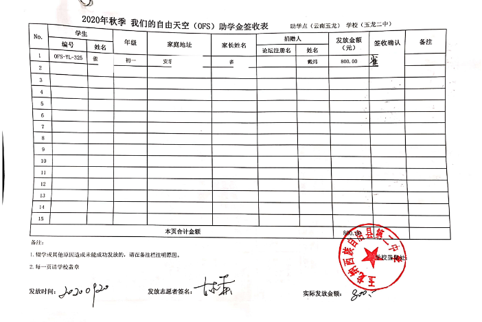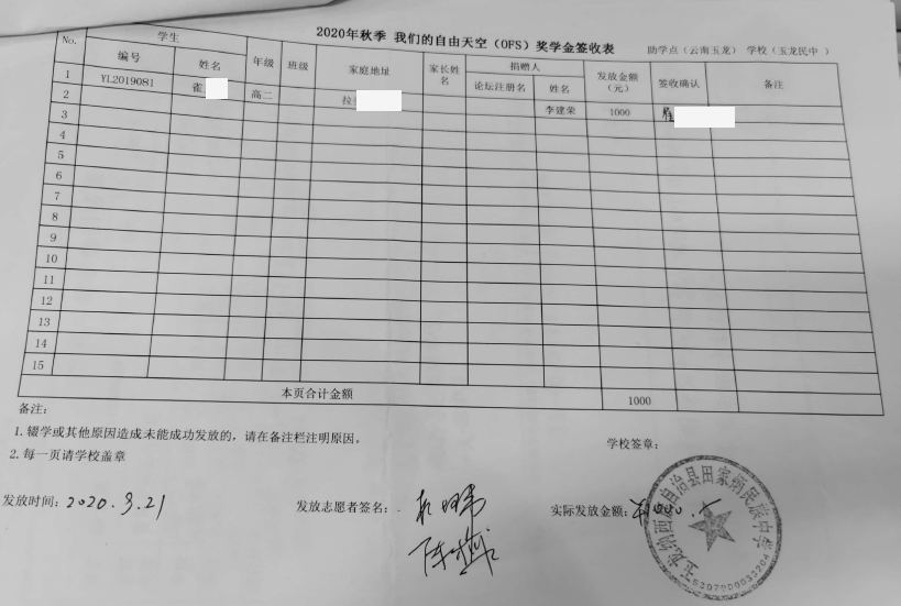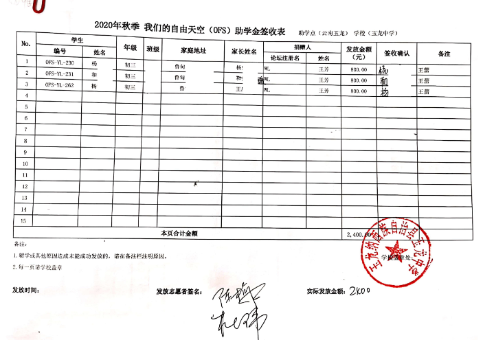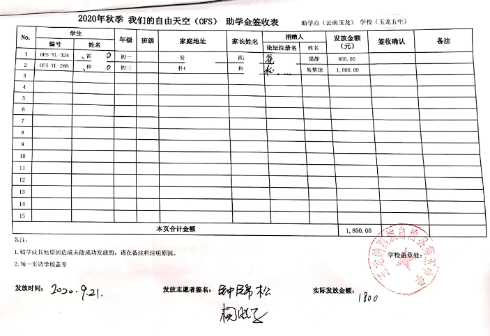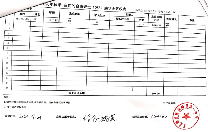 OFS走访志愿者在2020年9月21日-23日对云南省丽江市玉龙纳西族自治县及鲁甸乡助学点进行了走访工作,本帖针对玉龙助学点助学款发放工作做具体阐述。   +?j?|G