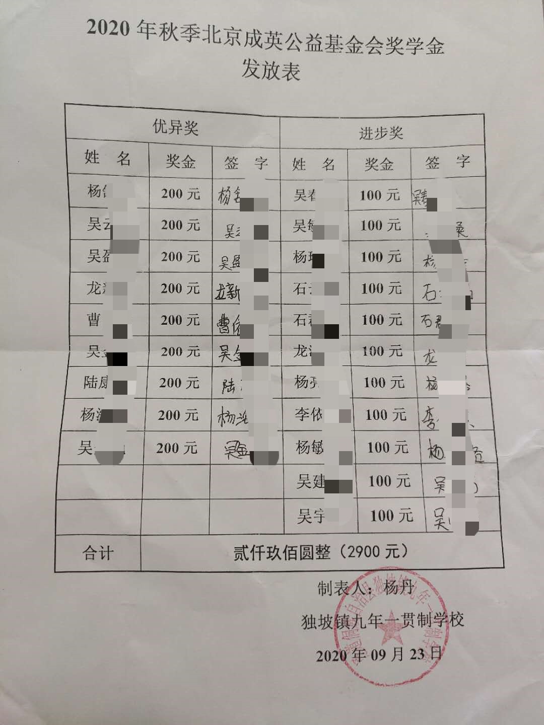 奖学金人数及金额:为20名学生发放奖学金,发放奖学金共计2900元