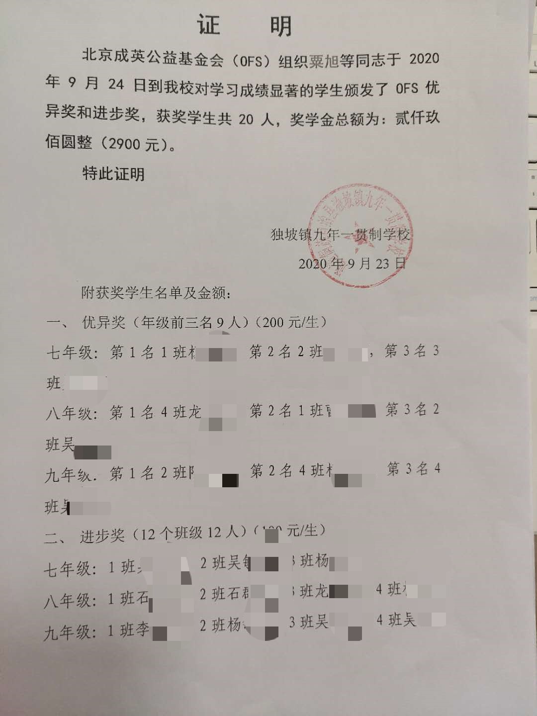 9月23日,OFS志愿者来到通道县独坡乡,为当地的20名学生发放了“地势坤”奖学金(优秀奖9名200元\人,进步奖11名100元\人),共计发放金额2900元。