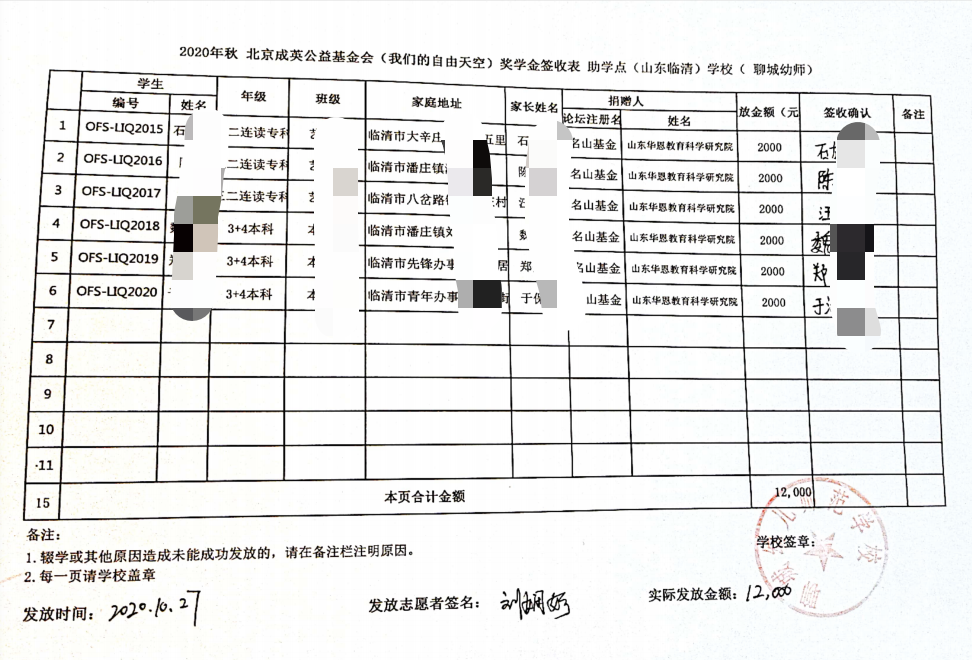 山东临清2020年秋季奖助学金发放于10月26日-29日顺利发放完成。