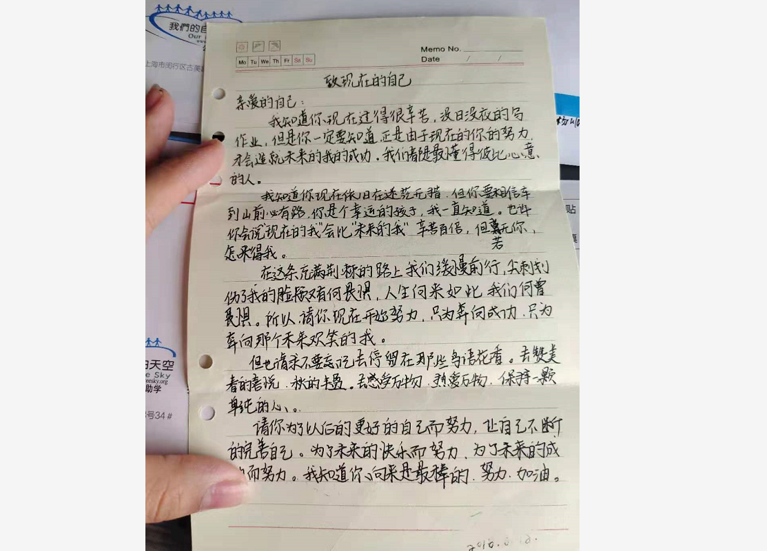 2019夏令营的最后一天,孩子们给两年后的自己写了一封信,两年后如约送到了他们的手中,也许这些孩子中大多数不能考入一个理想的大学,但是相信他们的人生中,夏令营十天的记忆足以他们去细细回味。