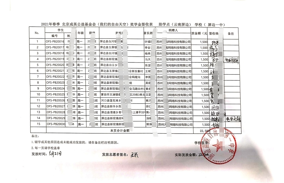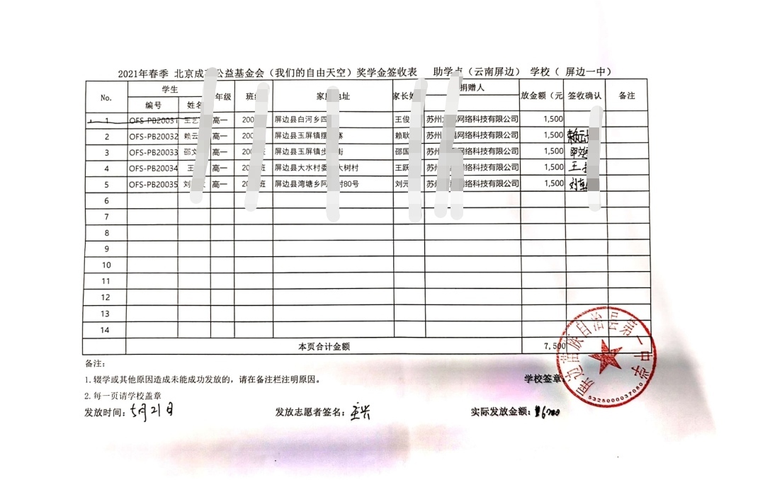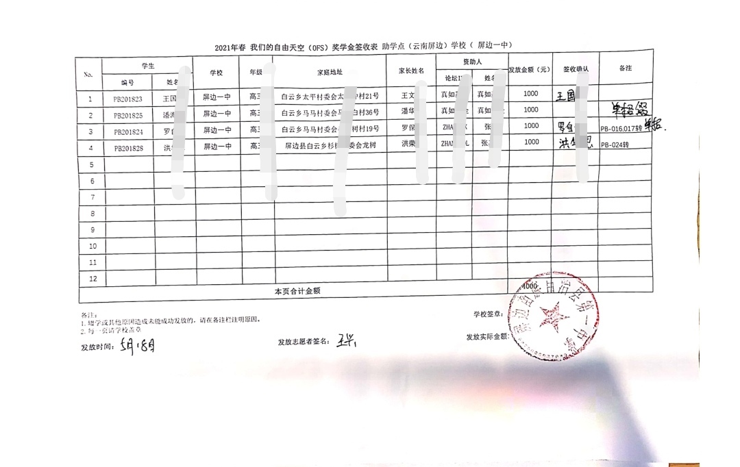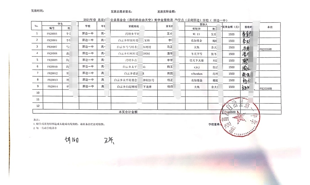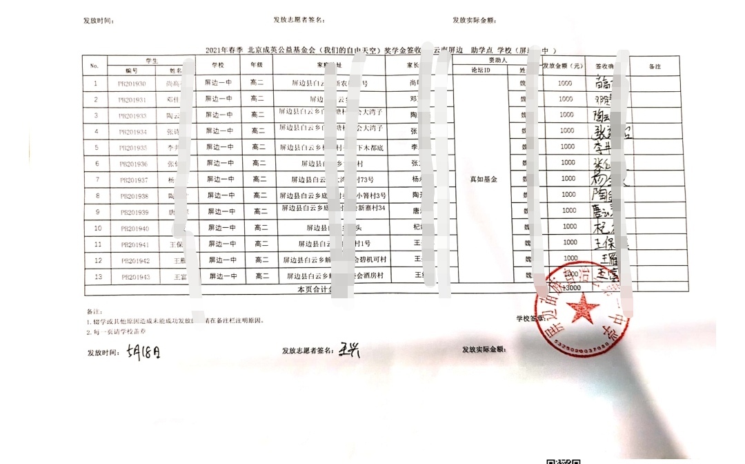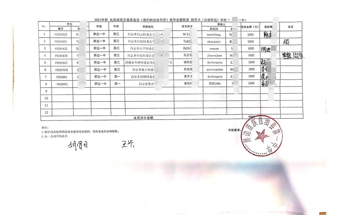 为保护学生隐私,签收表抹去学生姓名,学生资料待整理好后发送到资助人邮箱,如有疑问,请咨询pingbian@ourfreesky.org,或者kids@ourfreesky.org