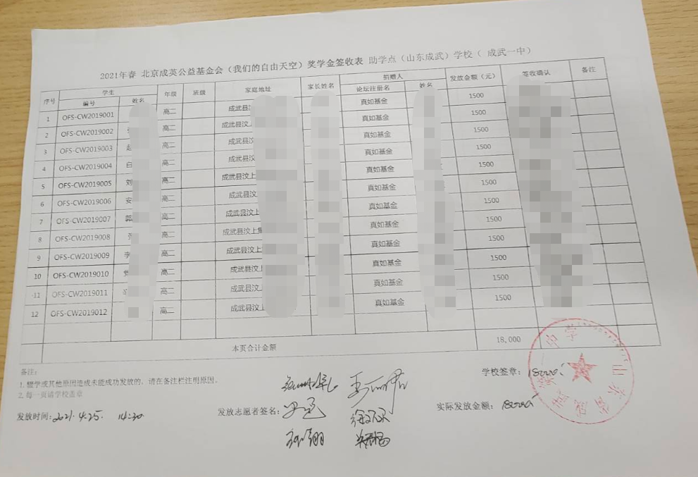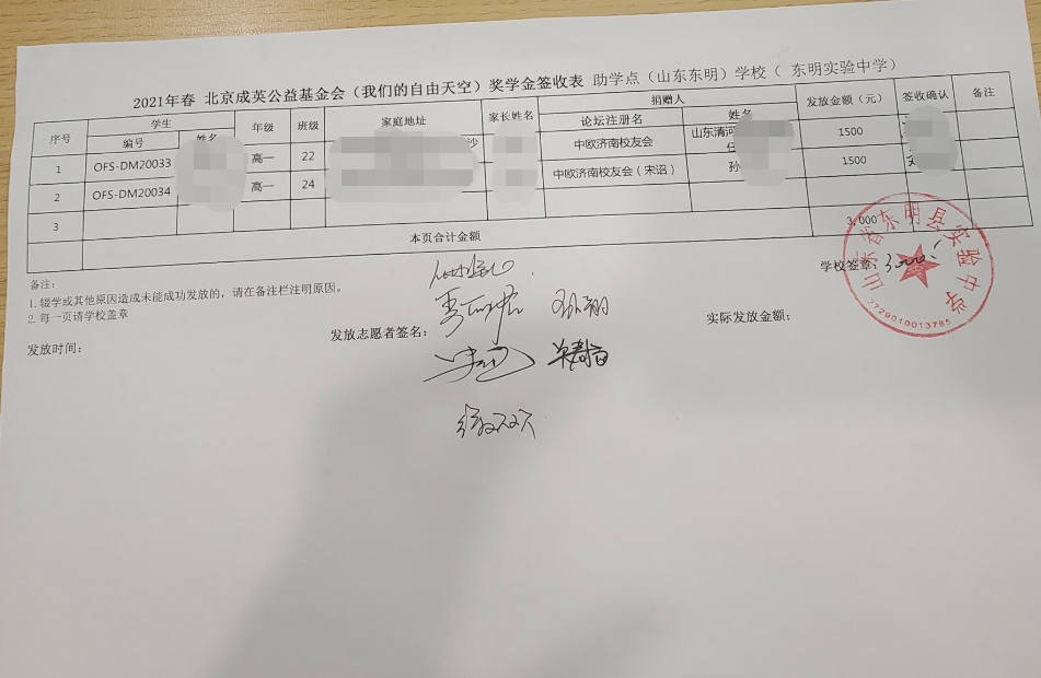 为保护学生隐私,签收表抹去学生姓名,学生资料将近期发送到资助人邮箱,如有疑问,请咨询heze@ourfreesky.org或者kids@ourfreesky.org