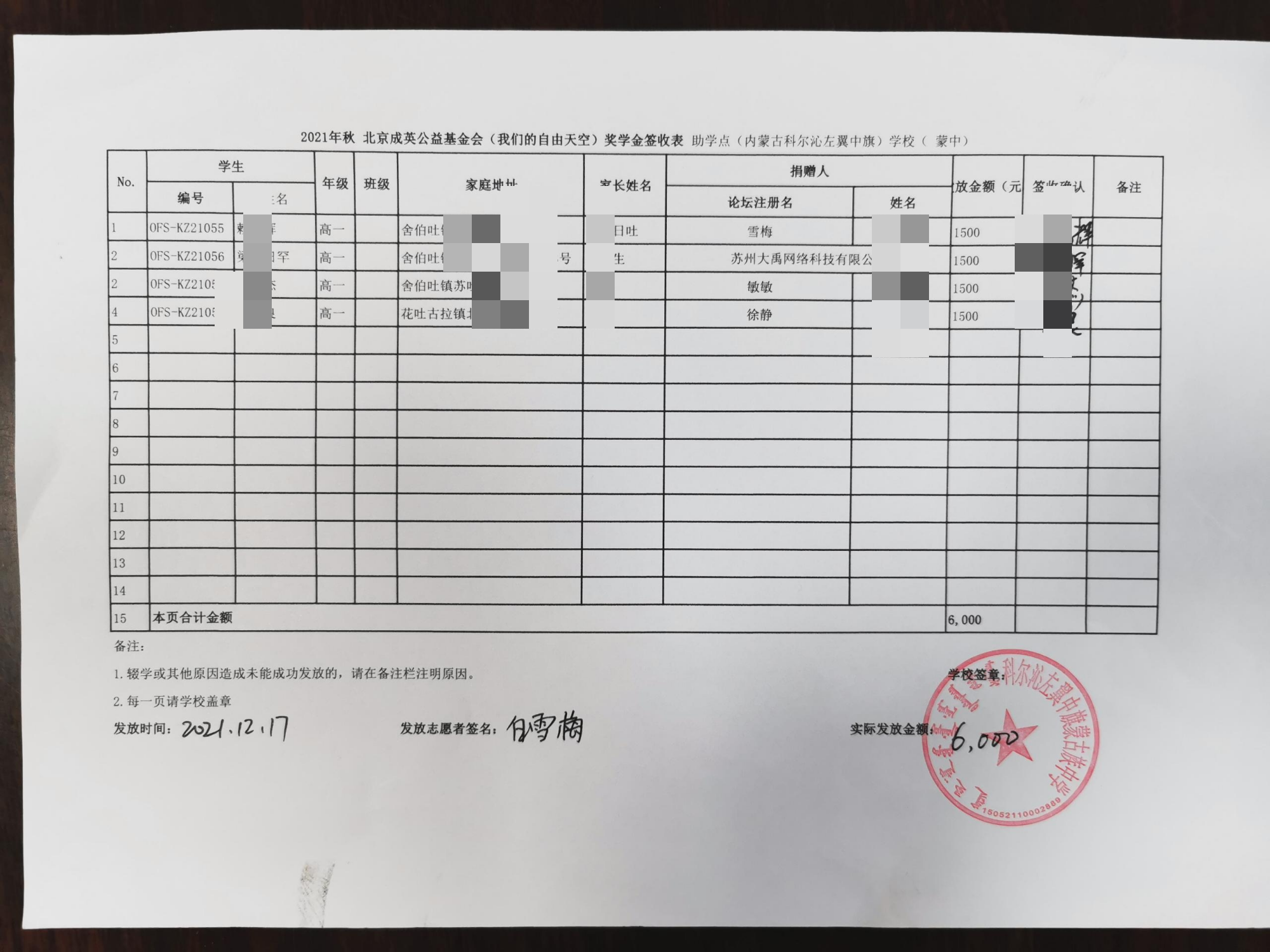 我们的自由天空 公益助学项目组(OFS,桃李天)>One-To-One Help:Central Plains and Eastern中原及东部助学>公示|2021秋内蒙古科尔沁左翼中旗奖学金发放公示