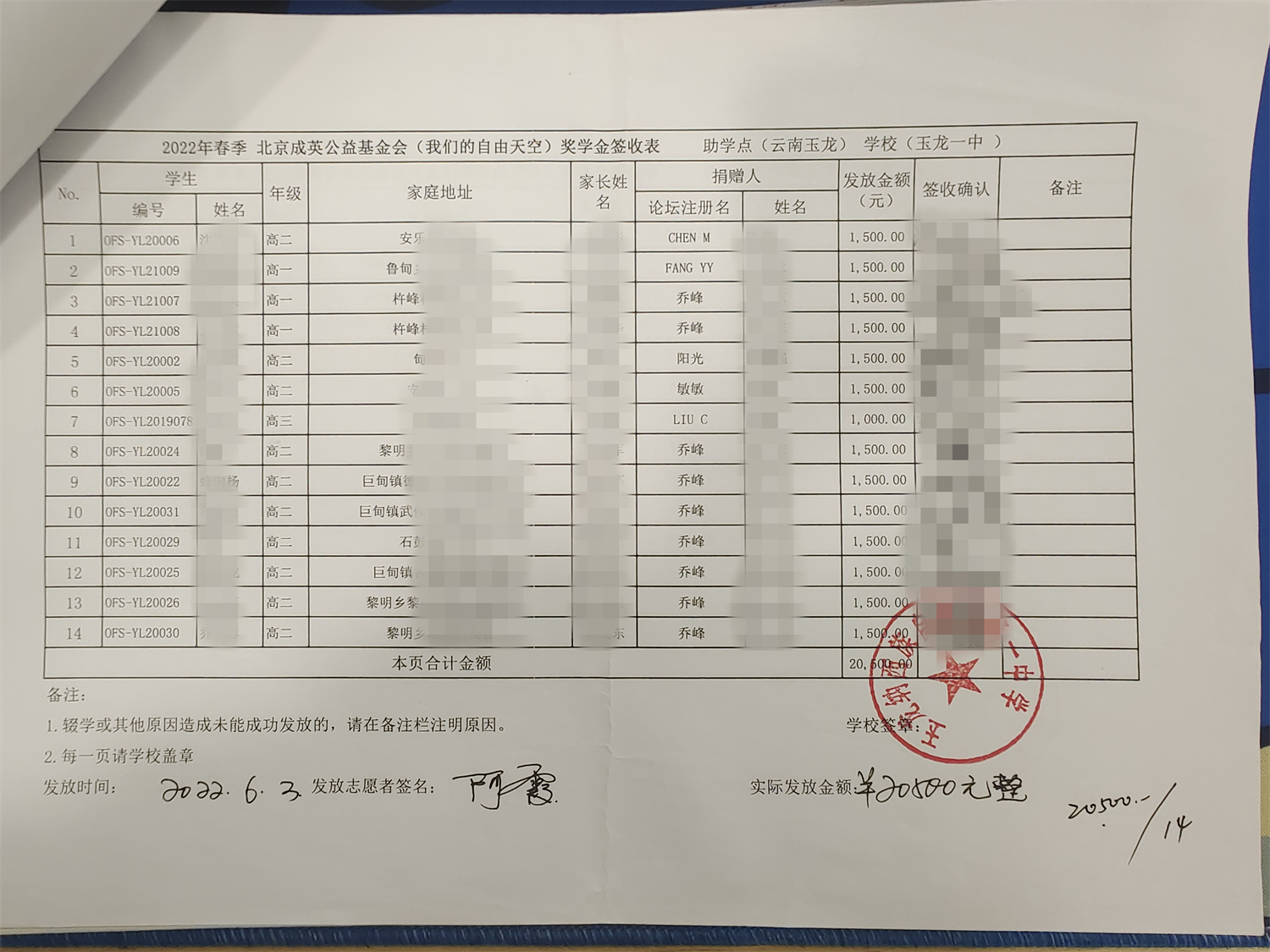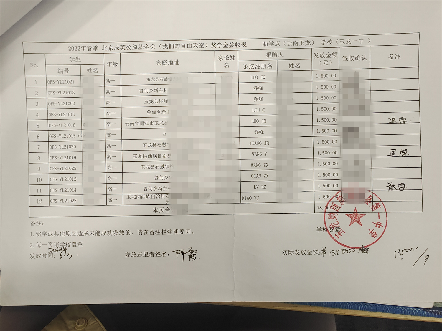 为保护学生隐私,签收表抹去学生姓名,学生资料待整理好后发送到资助人邮箱,如有疑问,请咨询yulong@ourfreesky.org,或者kids@ourfreesky.org DvG.G+mo#