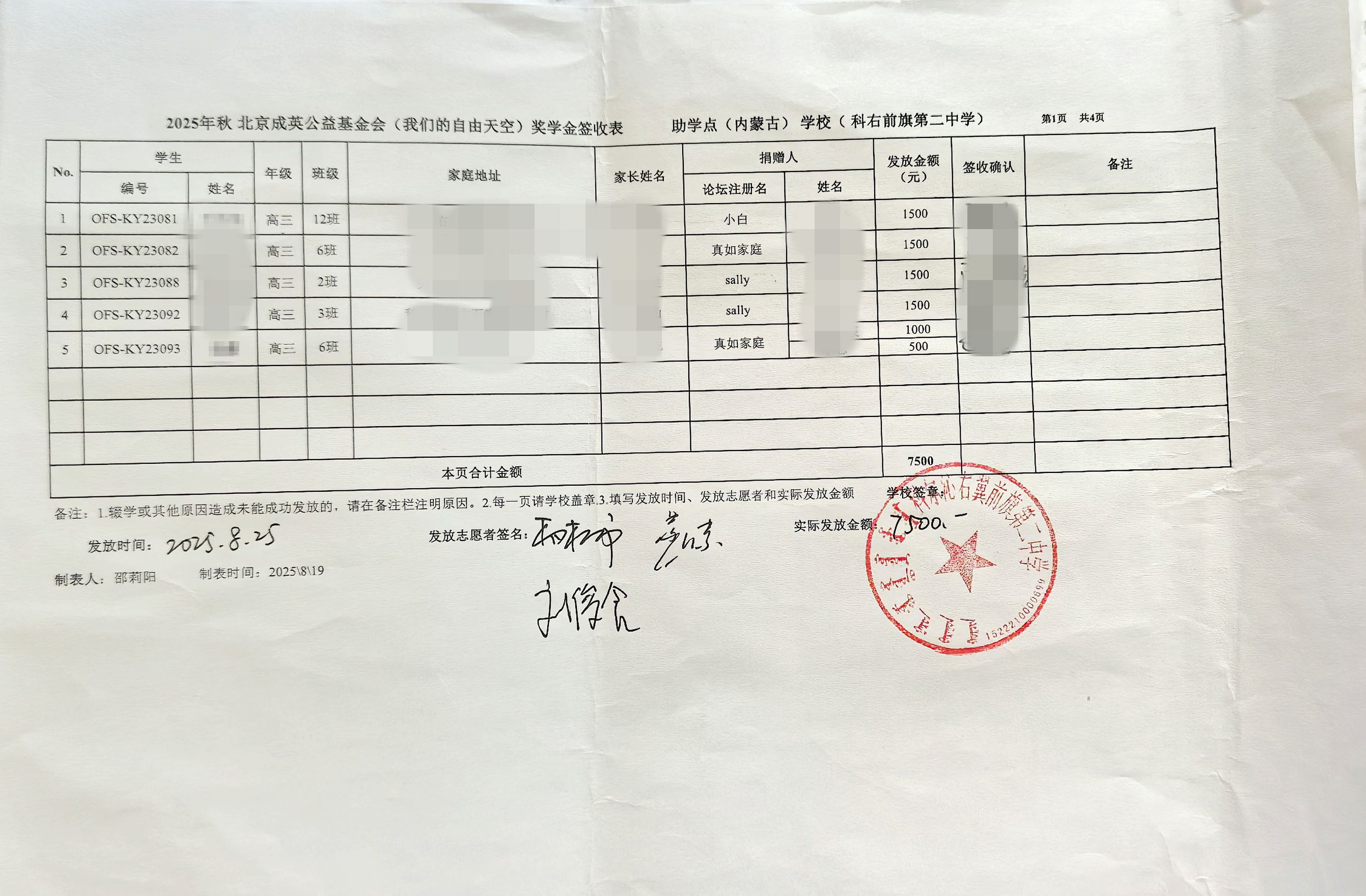 为保护学生隐私,签收表抹去学生姓名,如有疑问,请咨询kids@ourfreesky.org或者keyou@ourfreesky.org