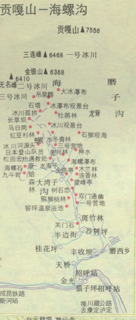 贡嘎山为国家级风景名胜区,位于甘孜藏族自治州泸定、康定、九龙三县境内,以贡嘎山为中心,由海螺沟、木格错、五须海、贡嘎南坡等景区组成,面积1万平方公里。贡嘎主峰海拔7556米,誉为“蜀山之王”,主峰周围林立着145座海拔五六千米的冰峰,形成了群峰簇拥、雪山相接的宏伟景象。贡嘎山有现代冰川71条,著名的有海螺沟一号冰川、贡巴冰川、巴旺冰川、燕子沟冰川、靡子沟冰川等。海螺沟冰川是国内同纬度海拔最低的冰川,最低点为海拔2850米,伸入原始森林6公里,冰川、森林共存。这里还有中国最大的冰瀑布,高1080米,宽1100米,每当雪崩发生时,冰雪飞腾,响声如雷,气势磅礴壮观。由于冰川运动形成了冰川弧、冰川断层和冰塔、冰桥、冰川石蘑菇、冰城门等许多奇异的造型。