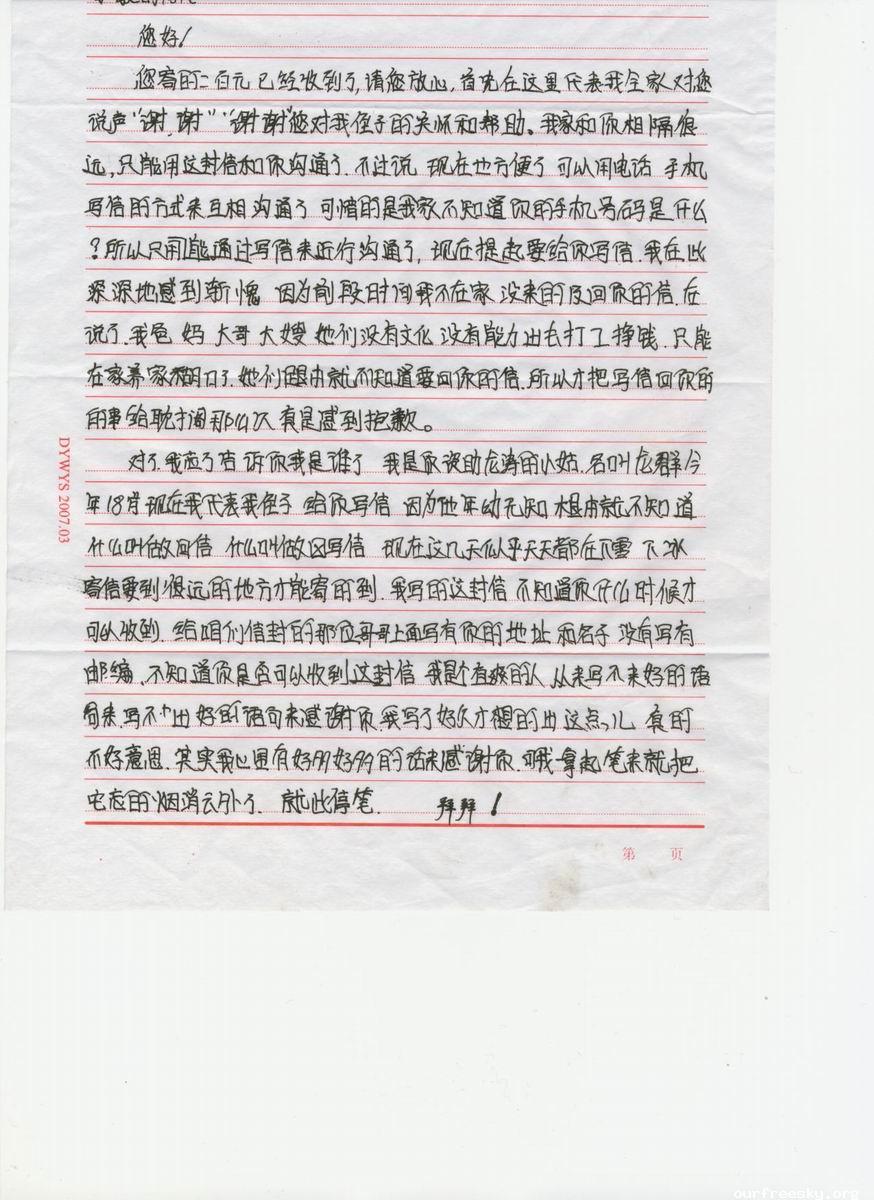 信件主要内容:姐姐,你放心,你给我寄的钱我已经收到了,放心吧!我感谢你对我的帮助,也同时感谢你看的起我们这贫困的农村学生。