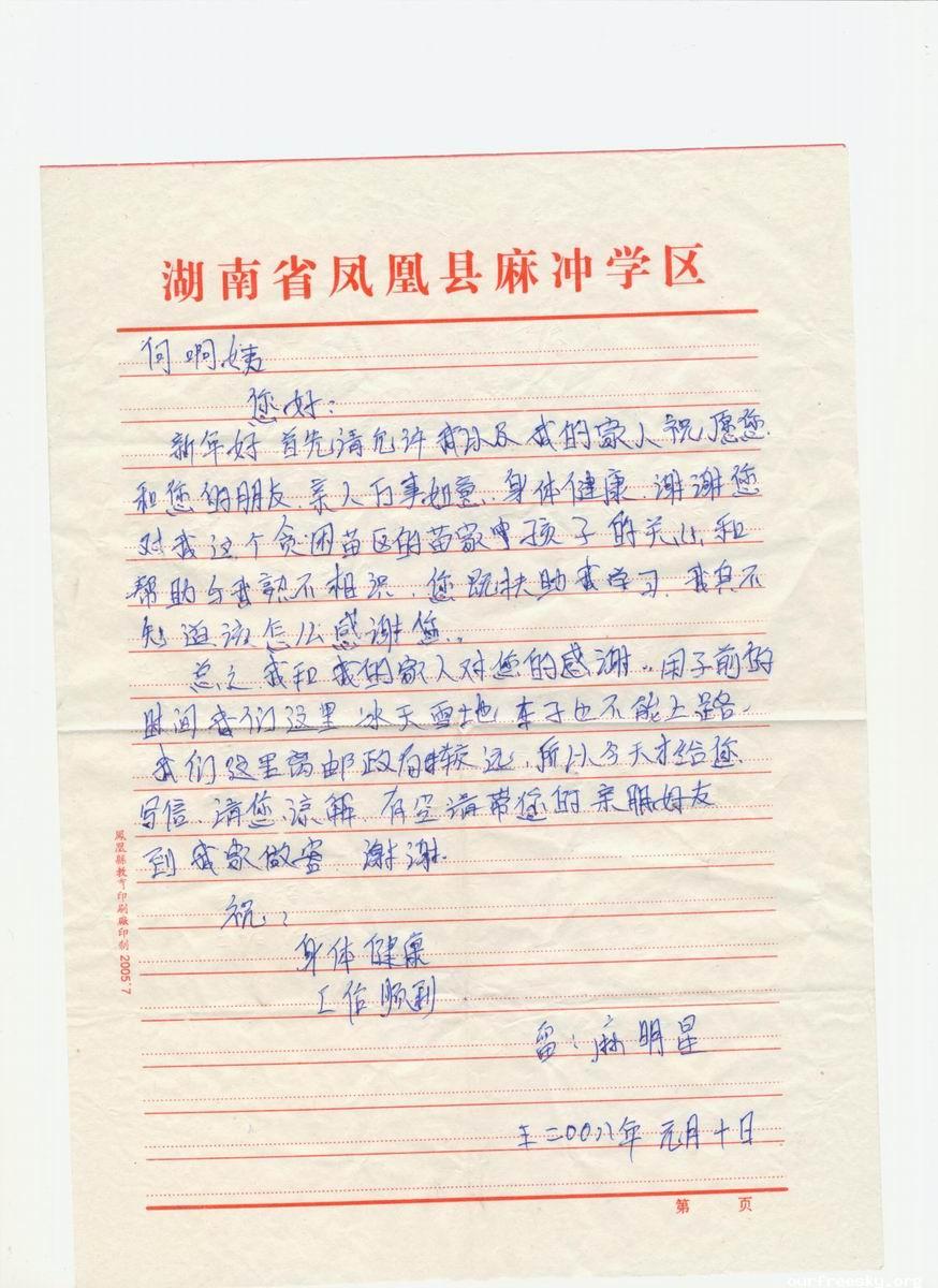 信件主要内容: 我和我的家人祝您和您的朋友、亲人万事如意、身体健康,谢谢您对我这个贫困苗区的苗家孩子的关心和帮助,我真不知该怎么感谢您。