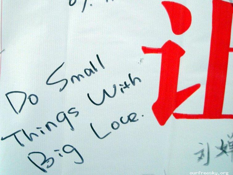 Do Small Things With Big Love,一句我在签名海报看到的留言。不知道在这里可不可以翻译成“礼轻情意重”,但作为本次活动的一名志愿者,我想这句话足可以代表参加11月4日在长沙新东方总部爱心捐书活动中所有捐书者和志愿者的心声。