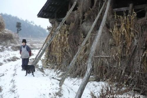 一路踏雪而来,终于到了村长家。我们住宿的是村长龙孟海家里,村长家里有三个房间,其实,就是三张床,在一个大屋子里面。摆着三张床,用布拉着。他从26岁开始当村长。