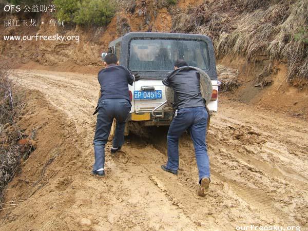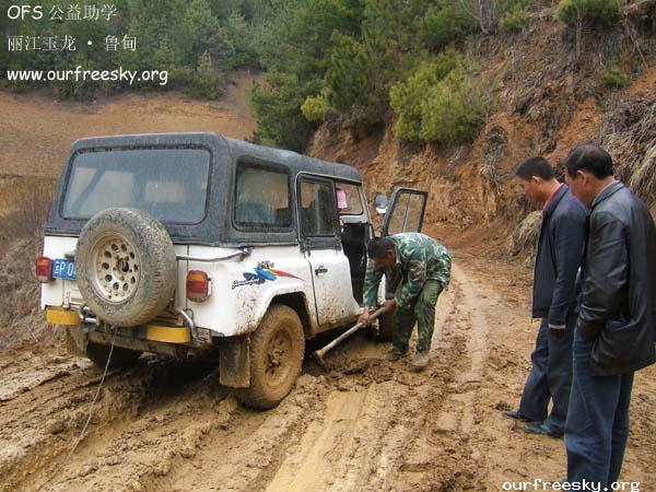 jjG?(1 @kLpK A%s"WSx, 正行着,突然陷在一个泥坑里。离路边的沟也很近,万一打滑的厉害,可能直接后退到沟里去。开车的师傅准备的还是比较充分的,就用镢头把车轮地下松软的泥土挖开,同行的杨老师等从后面推着才过了这一段。