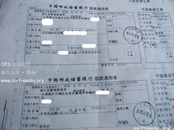 t[L'}ig!q 76*5/J- (PCv4:`g 由于村子在的地方离鲁甸乡里面邮局很远,孩子家里住的都比较分散。有一个最远的彝族寨子,离安乐完小走路要7个小时左右。和校长是等着赶集的时候,骑着摩托车到邮局去领了汇款单,然后在中心校把所有的汇款单都复印留了底,回到学校通知家长统一来领取。这样便于我们统计受助孩子收到助学款项的情况以及信息反馈。同时将受助孩子名单造册,家长领取资助款项的时候签字或者按手印。