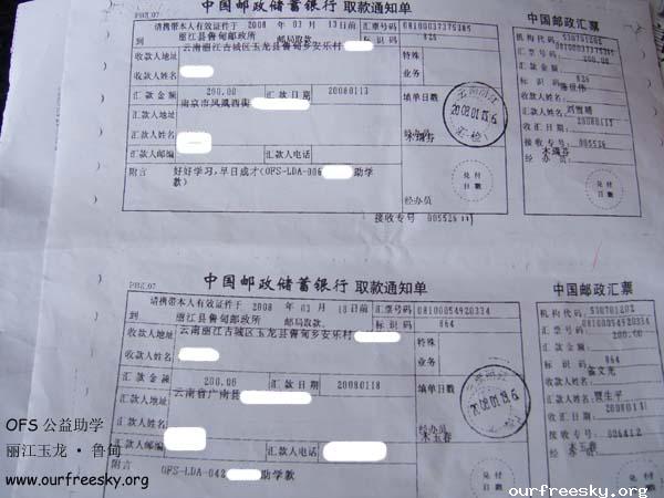 KIUa .@ElfPP(L Y|iALrx 安乐完小目前有48名OFS的受助学生,截至我们到达的当天一共有34个孩子收到助学款项。其余的款项已经汇出,但还没有收到,有OFS-LDA-037、044、061、062、065、068、071、072、075。 已收到款项的三个孩子OFS-LDA-036、039、046依然辍学在家,所以三个孩子的家长还没有到学校领取助学款项。三个孩子的资助人分别来自,安徽、北京和吉林。需征得资助人的意见之后,看这三个孩子的助学款项怎么处理?另,OFS-LDA-066的资助人lisagl由于怕3月13日第一次汇款的时候没有收到,在3月16日又汇款一次,在学校看见了来自南京的lisagl热心资助人的两份汇款单的复印件,汇款附言里写到:好好学习,早日成才(OFS-LDA-066 XXX助学款)。虽然简短的8个字,但是lisagl心意已经完全表达。