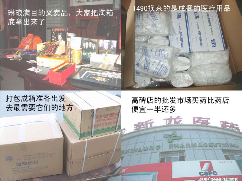 上次的义卖虽然只卖了1490元,但是我们尽力了,飞速赶往医药批发市场换来了绷带,口罩,注射器,输液器,纱带等三大箱,送到OFS交由爱心航线,统一送往四川省卫生厅. "F+m}GJ=a