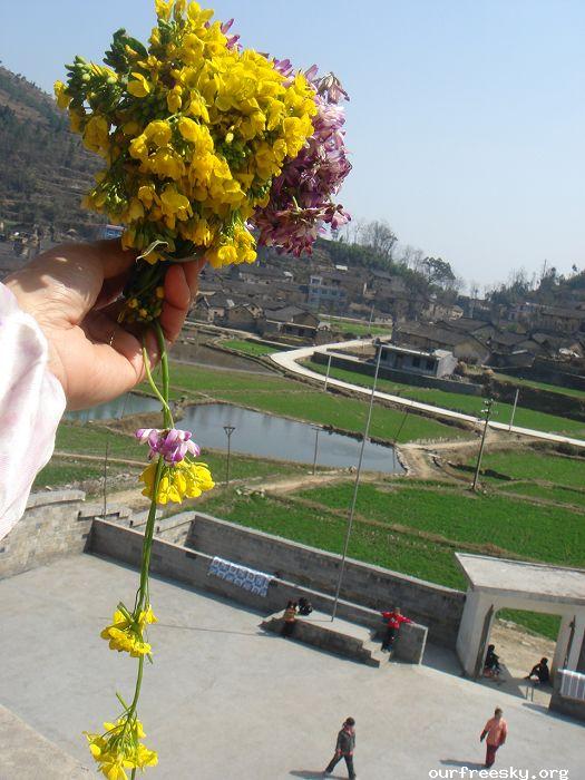 忙碌的一天——今天的太阳,和昨天比起来真是羞涩多了,羞羞答答的直到中午后才慢慢的露出来,一点光芒也时有时无,但我还是去洞里把穿了三个多星期的外衣和裤子洗了,借着一点阳光凉起来,回来的路上听见一阵童声唱着《七色光》,回头一看这是我们二年级的学生一边唱着上个星期教他们的歌一边走路来上学了。看见我时孩子们说老师好,一路走去学校,路边的油菜花已开得很艳,昨天就有学生给我送花,而且送个没停,我并不教学前班的同学,但当我在二年级上课的时候总有学前班的孩子跑进来放下花就走,没完没了。采了送,送了又采,还弄得整整齐齐,有的还串成一条花链子,发展到今天他们在教室里找不到我就跑到三楼送到我的宿舍,我真有点不知如何说了,有点心疼花儿这么无辜的被采摘。如果跟他们说尊重生命等于白说,因为听不懂。如果告诉孩子们,老师不要了,又怕伤害他们,花很漂亮,让她好好长吧,我们站在旁边观看一样很美,是吗?只能告诉她们这些话,但我想他们一样听不懂,因为他们只会说老师,你好,别的一概不会。