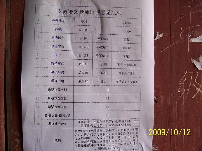 再说六年级这个班,之前是支教的董老师教过的,普通话和文字功底都是相当的不错,课堂纪律也是非常不错的,很少要维持课堂纪律,交代过上课只要和课堂有关的可以自由发言,但渐渐发现两个现象:一是有个别女生在用本地话说些无关的学习内容的事;二是在评奖作文的时候有女生提出不要和别的同学分享她的作文(原因大概是她觉得没这个必要,我告诉她如果是她私人的日记我们是不会拿出来分享的,作文本身就是一种写作的锻炼,只有和大家一起分享才会进步的,事实证明大部分同学的写作能力都在提高,有些进步是神速的,一开始连一句完整的句子都表达的不清楚,最近一篇写到自己的母亲已经是结构完整,首尾呼应);和他们交流发现他们的最大问题是视野和知识面的问题,民权村的几个屯子虽然离乡里不是很远,但毕竟是在山里面,进出很不方便,很少的学生到过乡里或是县城,布置的新作文是观60年国庆庆典有感,但全班举手家里能看电视的只有5,6个人,这种情况就决定了他们的世界只是民权这片天空,所知道的知识是非常的匮乏,(这个和乡里其它几个学校的孩子比都差得很远)他们理解和看到是世界是封闭的,这就是为什么他们背书(课本上的知识)学得不错,课外的一点也不知道,也因为老师的缺乏,他们的历史,自然等副科是从来没开过的;于是就有同学(特别是女同学)觉得老师是在讲课文就是在上课,如果从课文延伸出去就是在说废话(例如从《计算机和多媒体》讲到计算机的基本知识和万维网),说到这里也有朋友要说山里的孩子本来就不了解这些,就是了解了,他们的生活也只是这样,对于他们的生活能有什么帮助呢?还不如不去了解,事实上这个世界也在发生着变化,谁说他们的生活就不会改变呢,他们目前的生活是非常困难的,这种困窘当然受自然条件的约束,但某种原因也是他们自己造成的,因为封闭和无知,他们愿意选择这种生活(前面说过有的家庭已经是很多个孩子,最近听说还有6-7个孩子的家庭,有些女生小学还没毕业就要嫁人生孩子了)。<从整个中国看,又何尝不像一个民权村啊,人们多是自闭和缺少信任的,埋头关心的是自己家的那些事,对于外面和未知的世界缺少关心和探索的热情,还有些疯狂的生殖崇拜>基于上面这些浅薄的认识,个人认为还是打开他们的想象力,鼓励他们改变自己生活的勇气,展望外面世界和未来生活的勇气,当然并不是每一个都能走出去或想走出去,但有一个两个…十个八个也许有一天能改变家乡的环境,谁说不是希望呢…