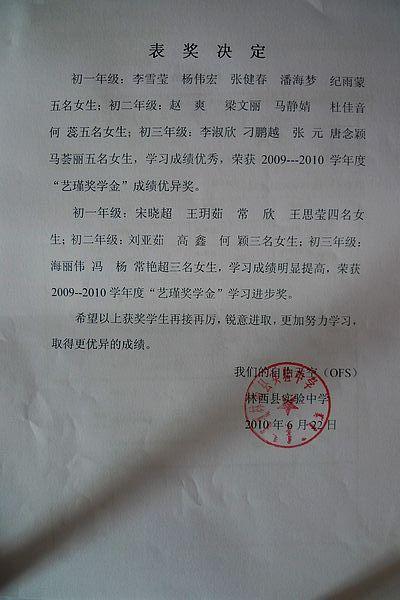 该校面向5个农村乡镇招生,学生中百分之九十来自农村,良好的管理和各界的支持,使得学校在硬件设施和校风校貌方面非常的出色,但在激励学生发奋学习以及图书馆书籍方面还有可以提高的地方,于是我们的自由天空公益助学项目组决定并根据“艺瑾奖学金”设立者的要求,在林西实验中学设立“艺瑾奖学金”。 并且内蒙古赤峰昭乌达妇女可持续发展协会作为我们的另一位合作方也决定在林业中学设立奖学金,将会奖励在中考中考试成绩最突出的女学生1名,奖金2000元。