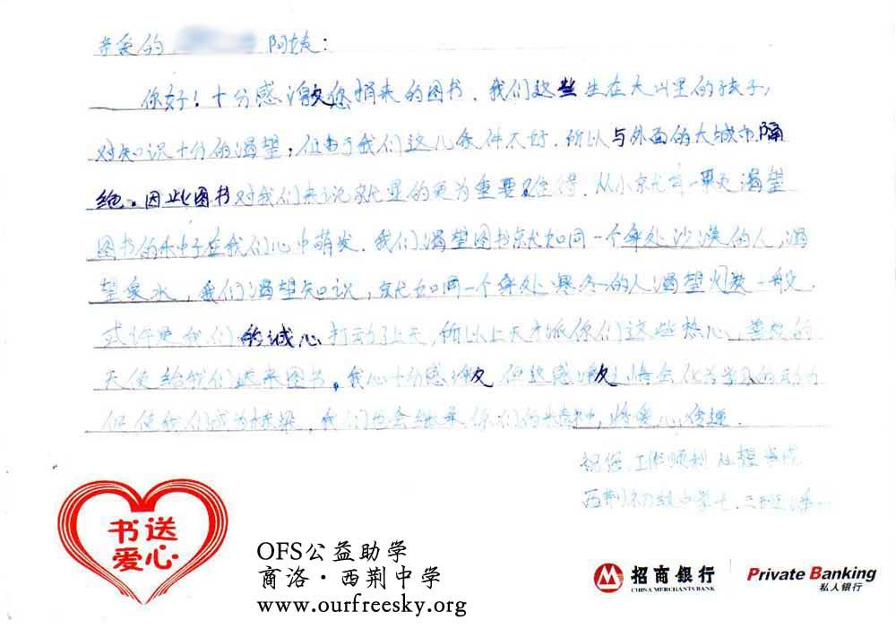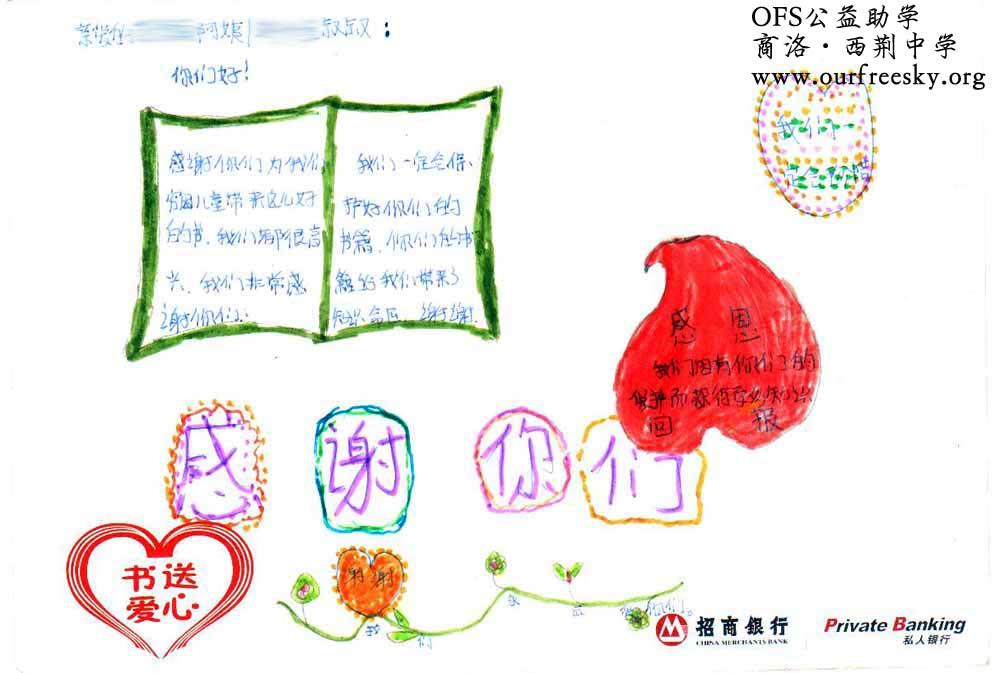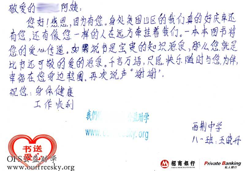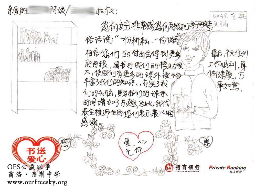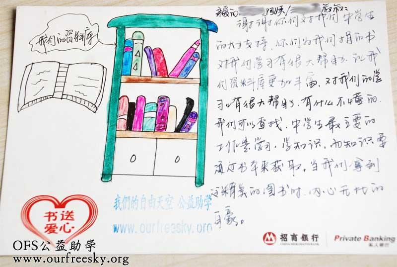 第一期“书送爱心”活动收到的感谢卡,来自陕西省商洛市商州区西荆初级中学: