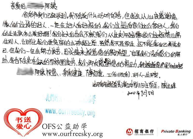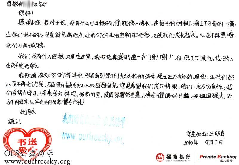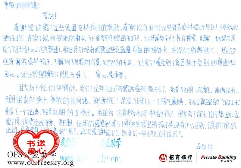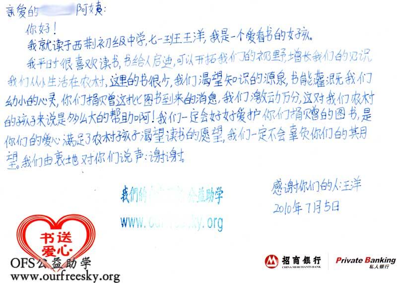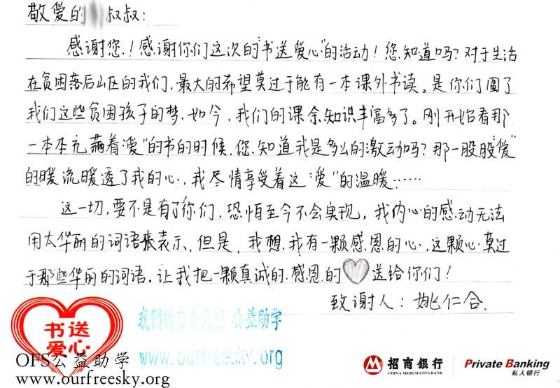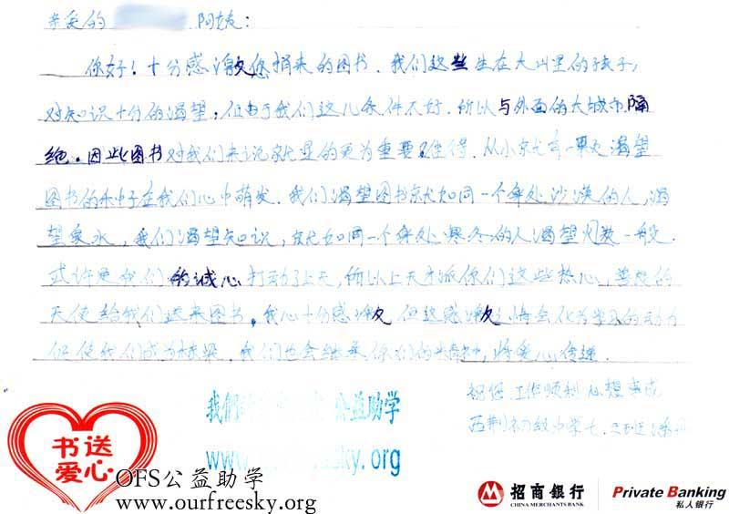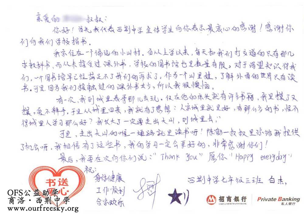 第一期“书送爱心”活动收到的感谢卡,来自陕西省商洛市商州区西荆初级中学: